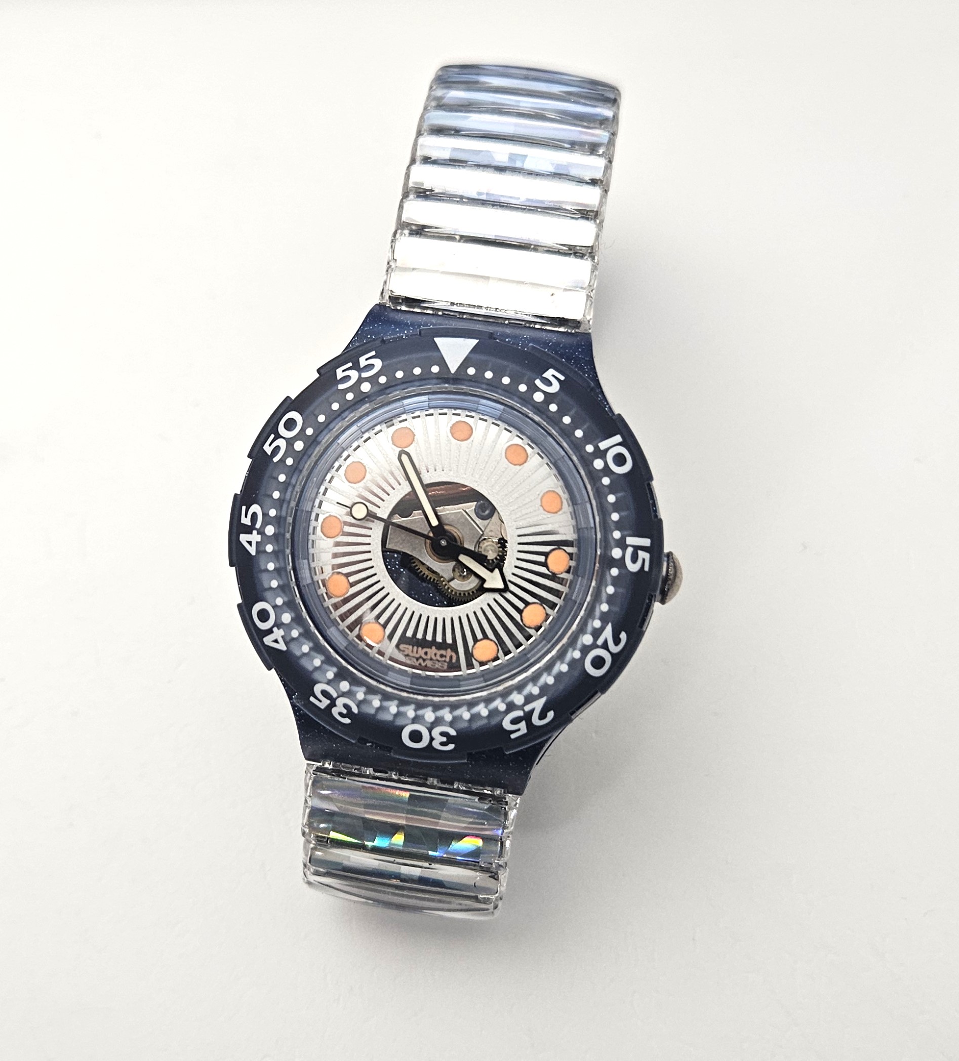 Swatch Scuba 1993 - SDN107 - Silver Trace flex strap - NUOVO - perfettamente funzionante nella sua custodia originale - Display analogico - Resistente all'acqua fino a 20 bar - Tipo di movimento Quarzo Svizzero - Cassa in plastica e Cinturino elasticizzato
