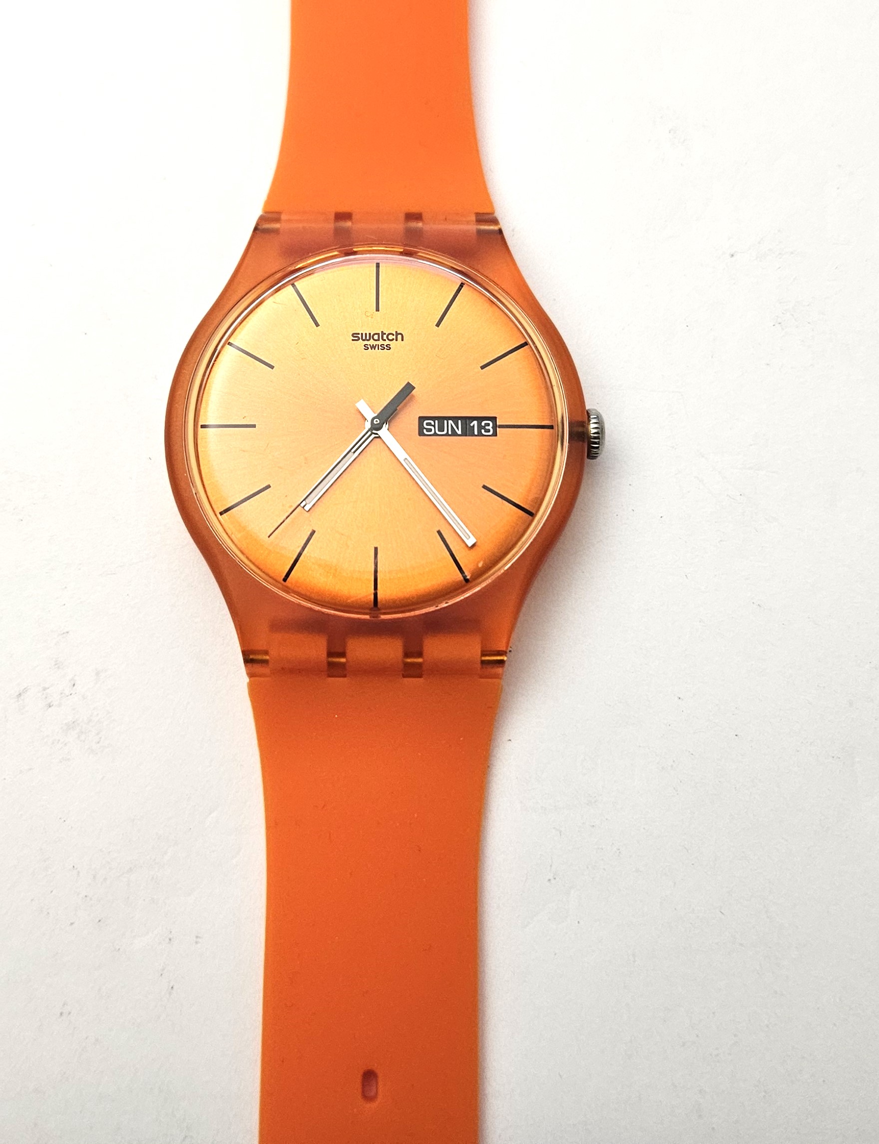 Swatch New Gent 2012 - SUOO700 - Pumpkin Rebel - Leggermente usato - perfettamente funzionante senza la custodia originale e garanzia - Display analogico - Resistente all'acqua fino a 3 bar - Tipo di movimento Quarzo Svizzero - diametro cassa 41 mm -