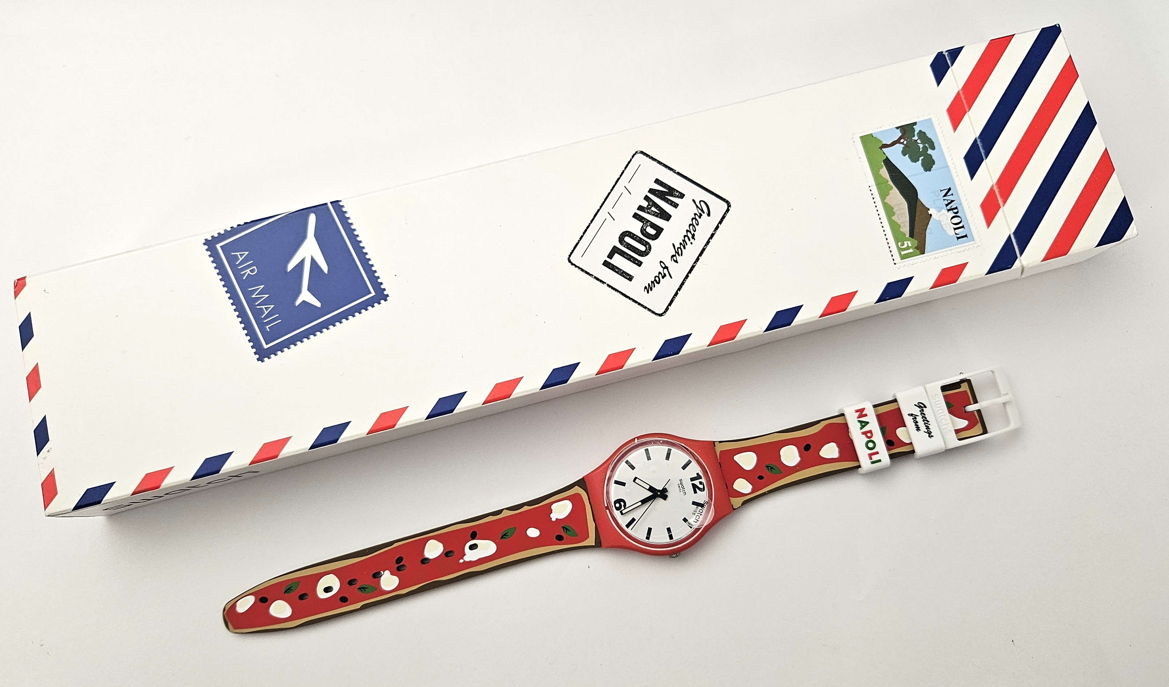 Swatch Special 2018 - GR162E - Napulé - Greetings from Napoli - NUOVO - perfettamente funzionante nella sua custodia originale - Display Analogico - Resistente all'acqua fino a 3 bar - Tipo di movimento Quarzo Svizzero - cassa in plastica e cinturino in silicone -