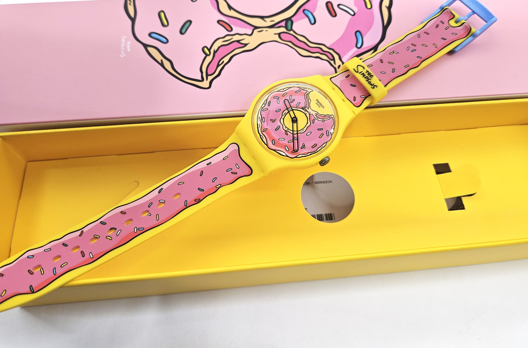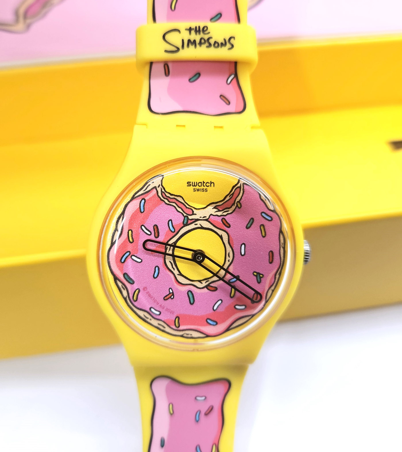 Swatch Special 2023 - SO29Z134 - Seconds of Sweetness -The Simpsons - NUOVO - perfettamente funzionante nella custodia originale - Display analogico - Resistente all'acqua fino a 3 bar - Tipo di movimento Quarzo Svizzero - Cassa 41 mm - Cinturino in silicone -
