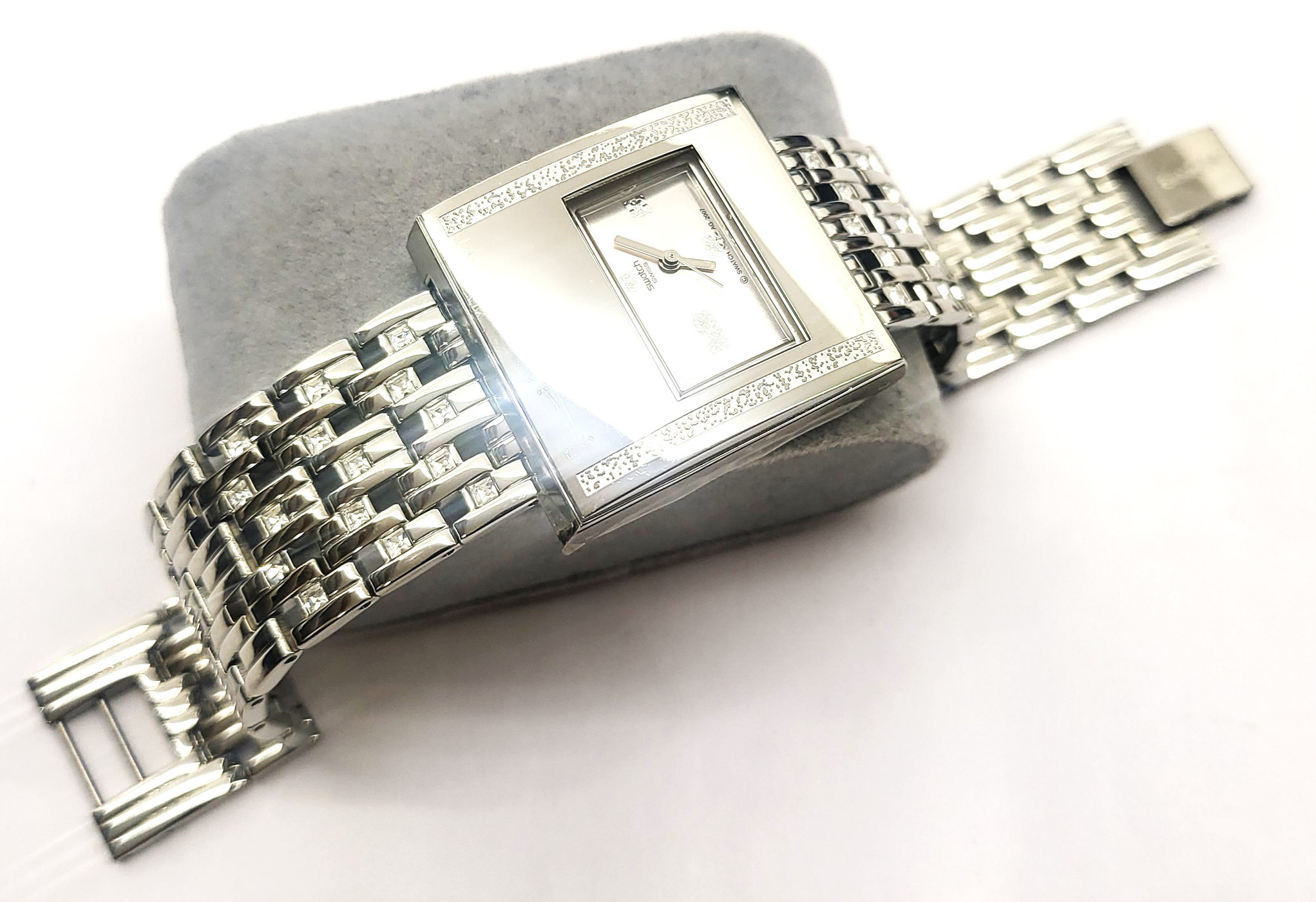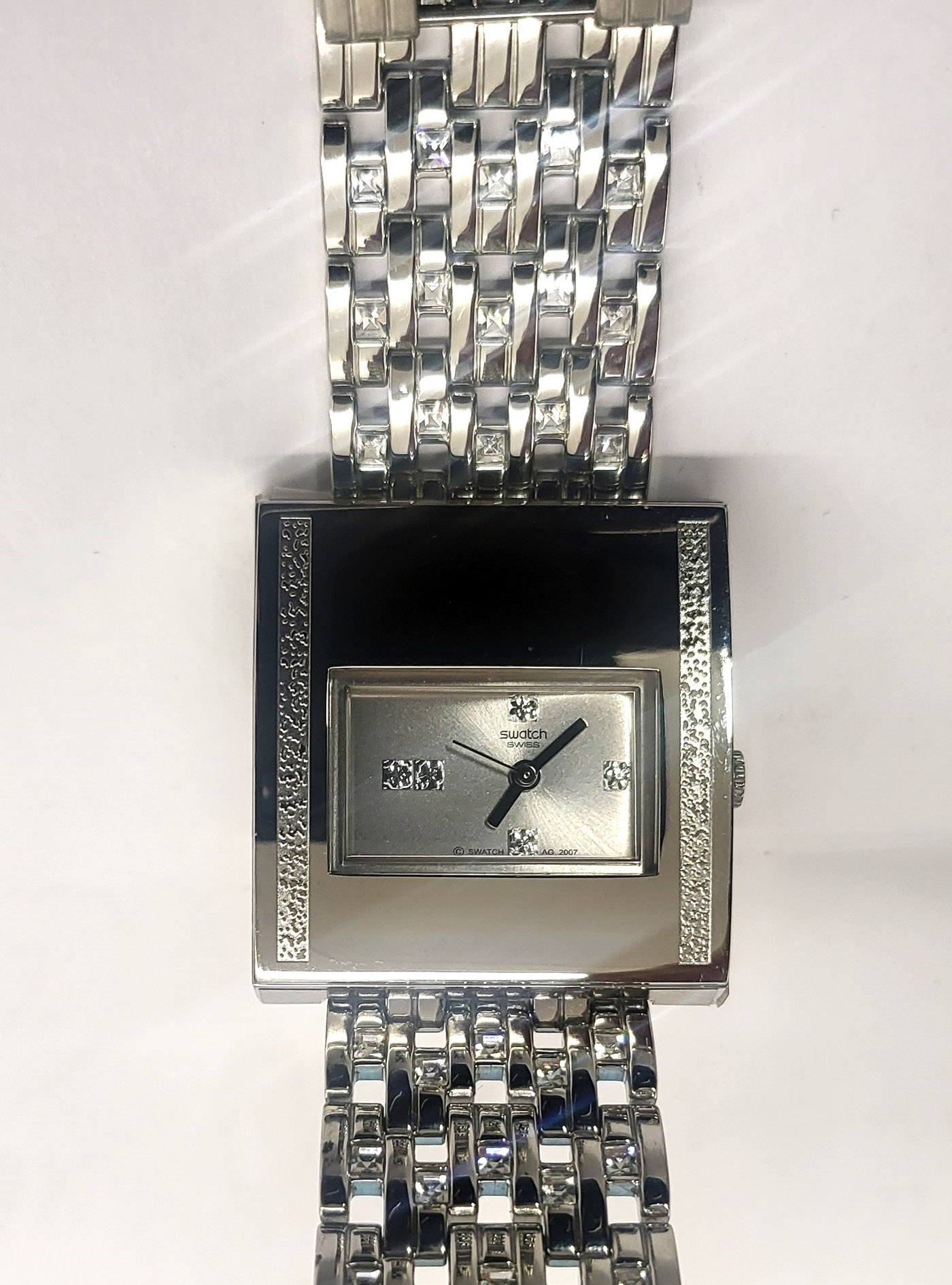 Swatch Irony Lady Square 2009 - YUS120G - Chroma Lux- Nuovo - diametro 31 mm. - perfettamente funzionante nella sua custodia originale - Display Analogico - Resistente all'acqua fino a 3 Bar - cassa e cinturino in acciaio -