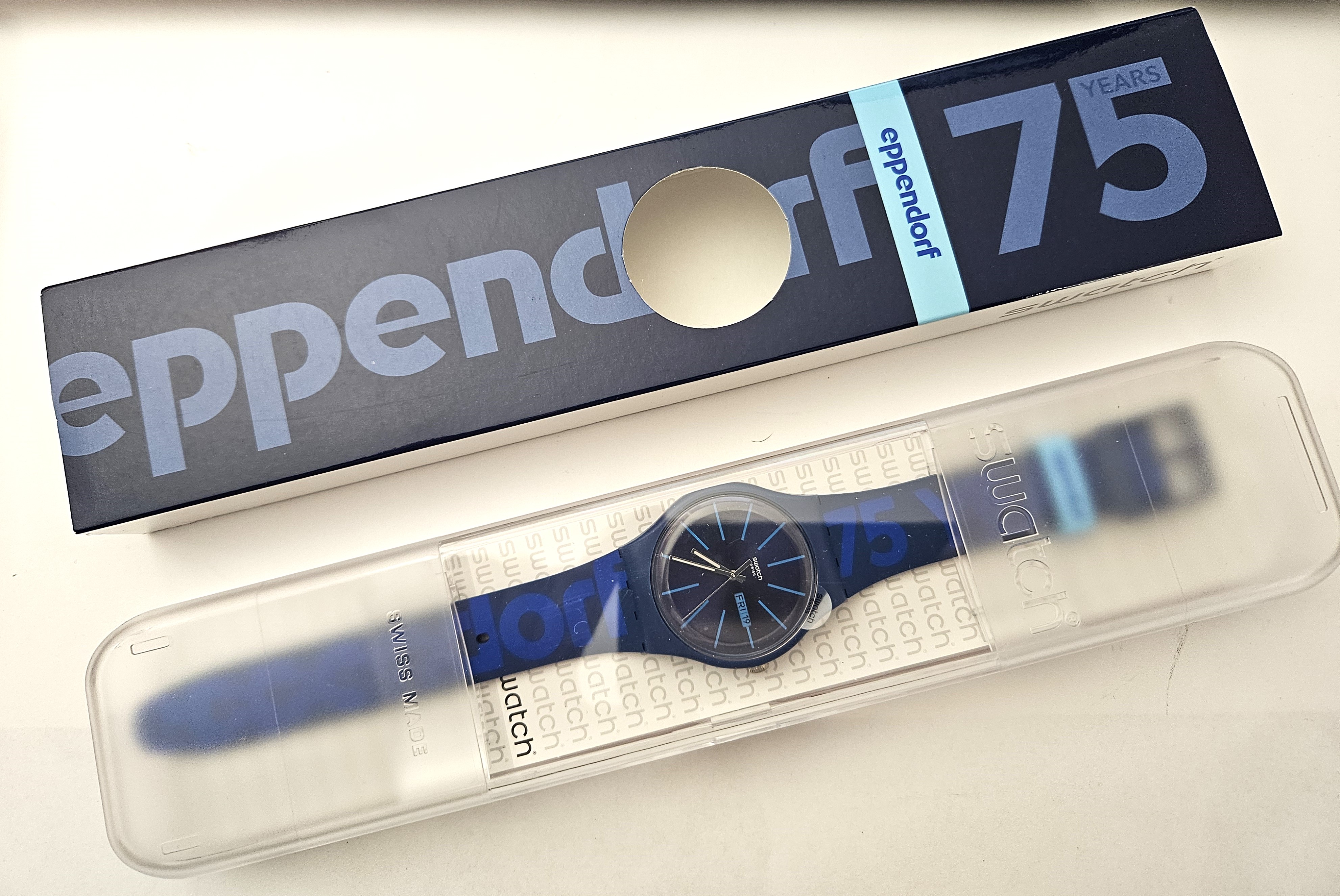 Swatch New gent 2019 - SUON713C - Wave Path promo Eppendorf - Nuovo - 75.mo anniversario - perfettamente funzionante nella sua custodia originale - Display Analogico - Resistente all'acqua fino a 3 Bar - diametro cassa 41 mm -