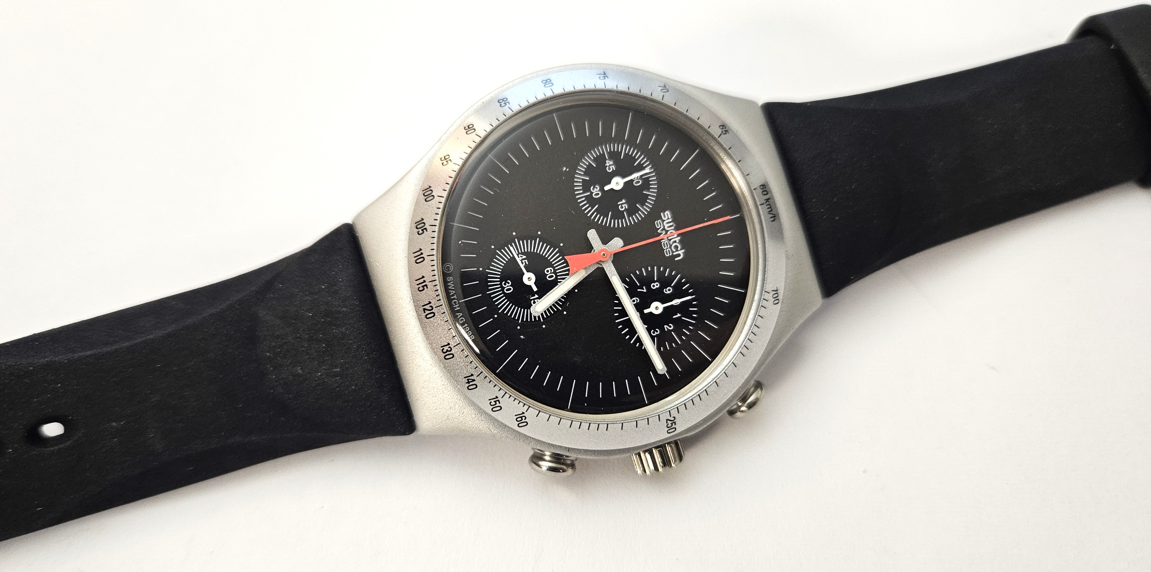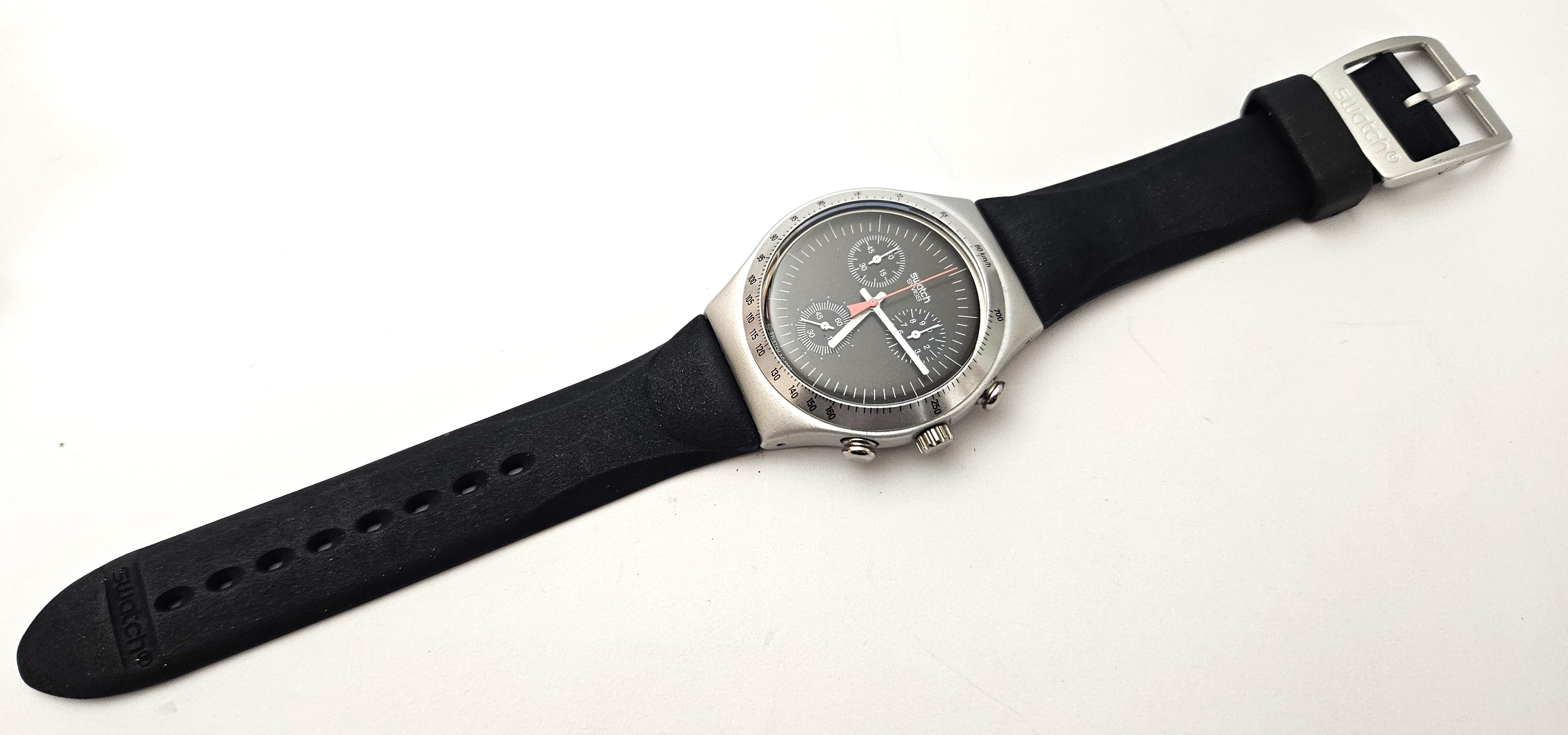 Swatch Irony Chrono 1997 - YCS1007 - Time Cut too - NUOVO - perfettamente funzionante nella sua custodia originale - Display cronografo - Resistente all'acqua fino a 3 bar - Tipo di movimento Quarzo Svizzero - Cassa in alluminio e Cinturino in gomma -