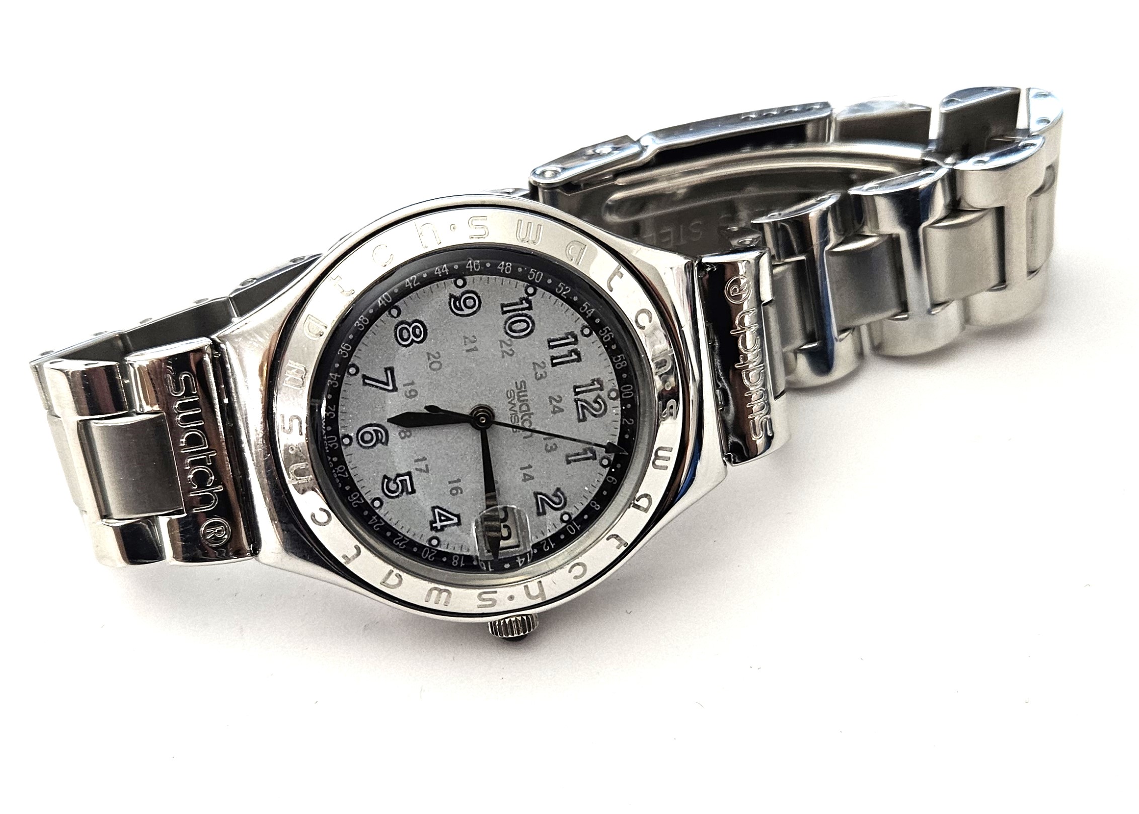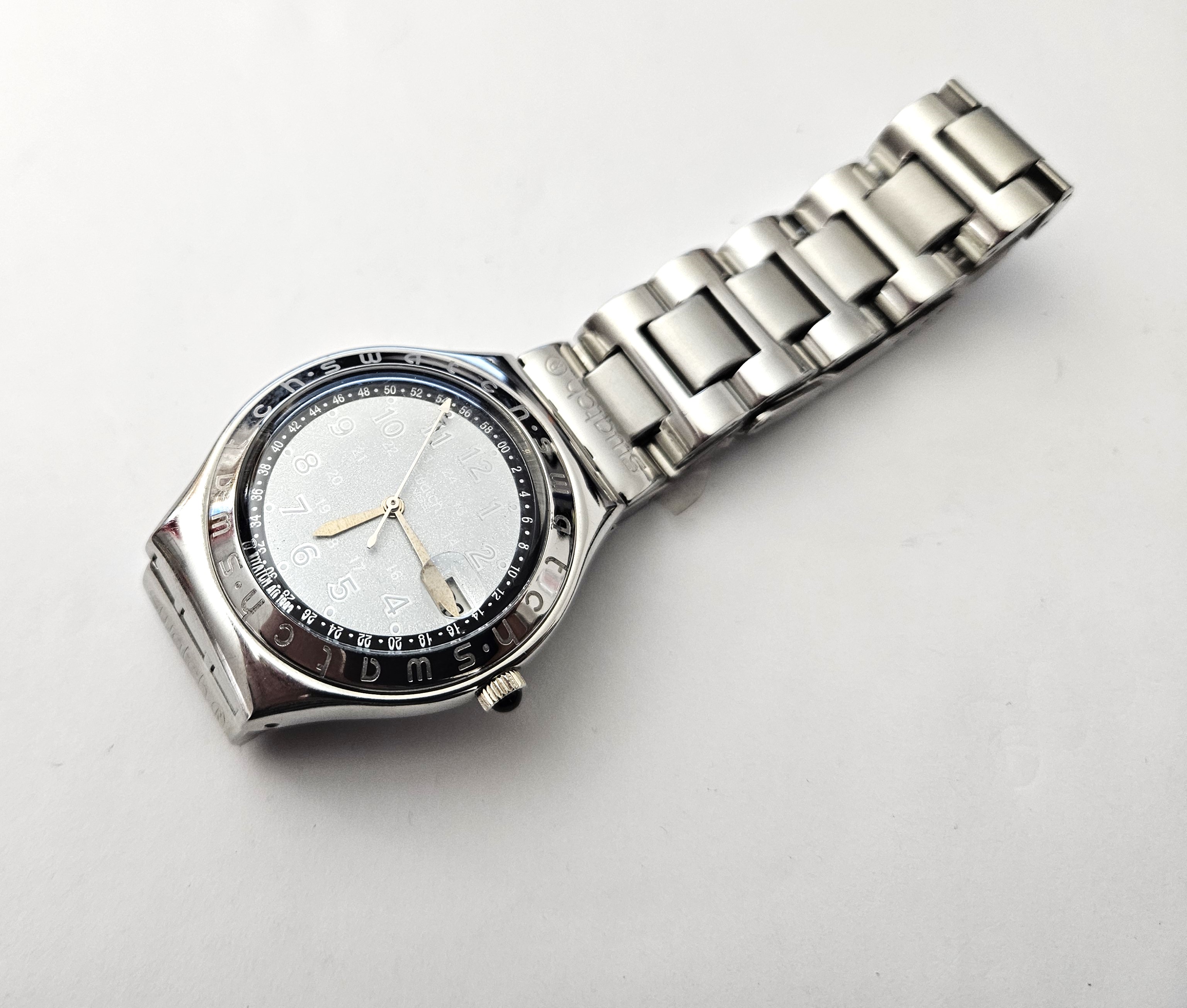 Swatch Irony 1997 - YSG412C - Happy Joe Light Grey - Leggermente usato - perfettamente funzionante senza la sua custodia originale - Display Analogico - Resistente all'acqua fino a 3 bar - Tipo di movimento Quarzo Svizzero - cinturino in acciaio -