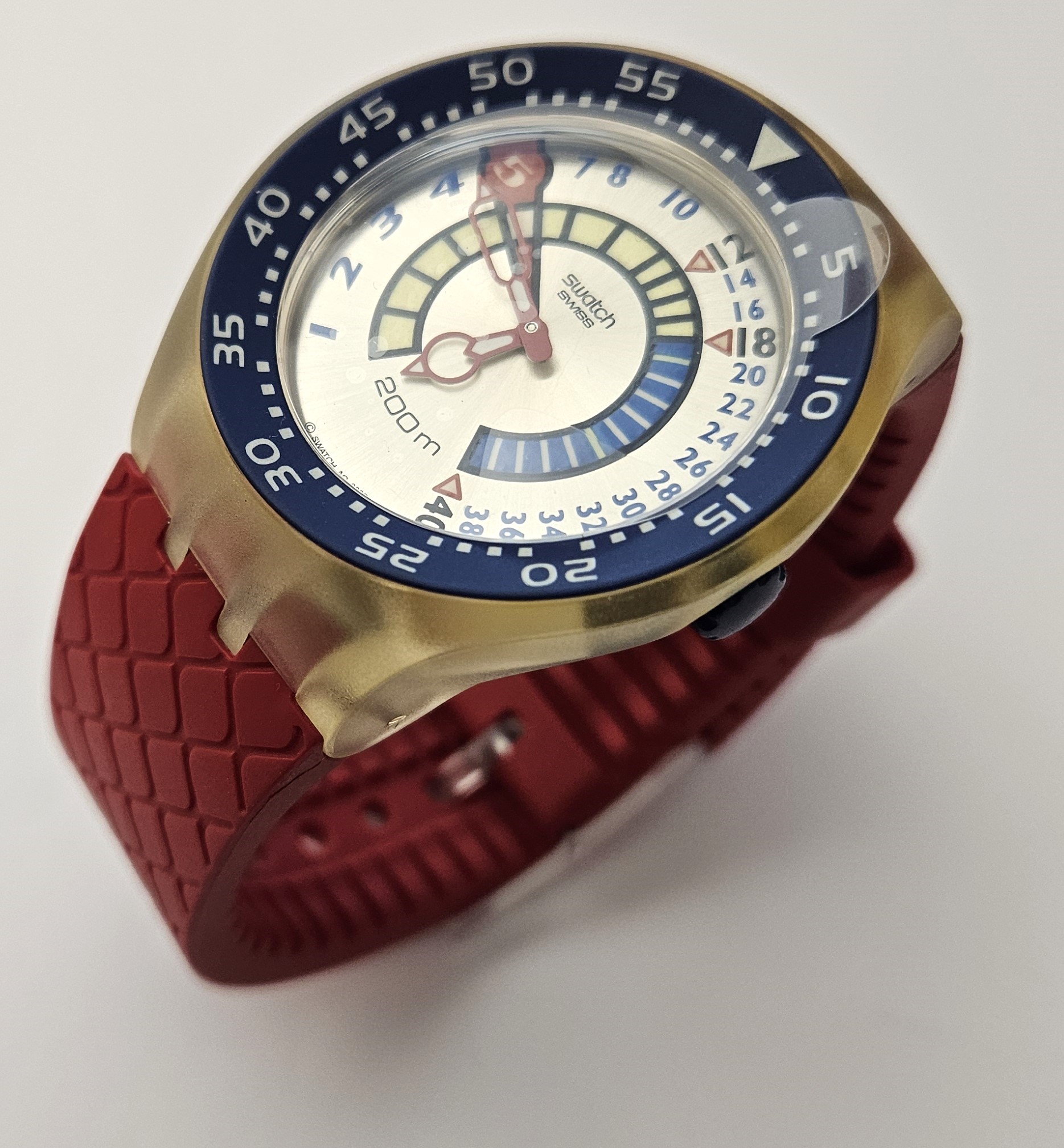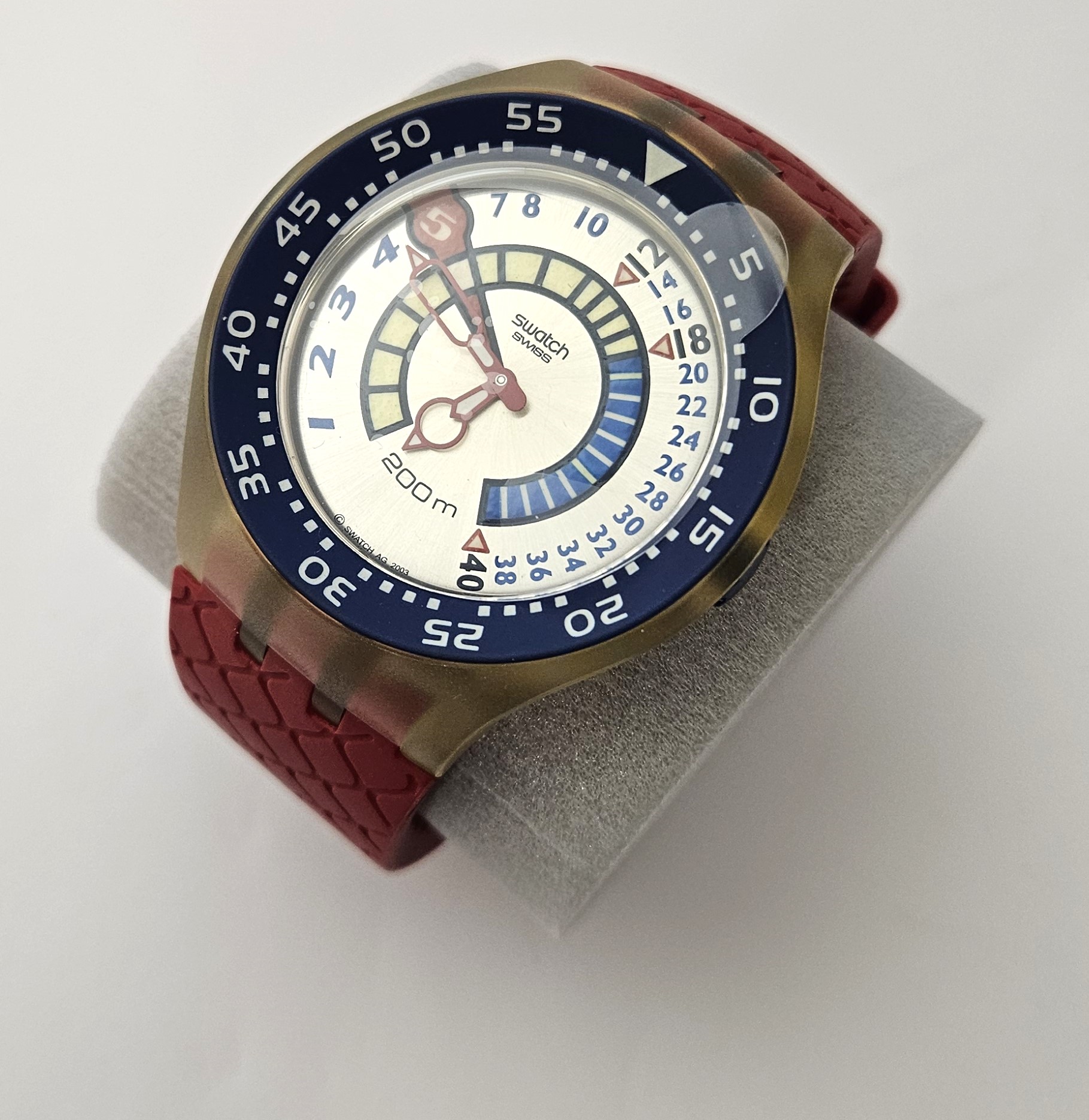 Swatch Fun Scuba 2004 - SUGK102 - Red Scale Tuna - NUOVO - Misuratore di profondità - perfettamente funzionante nella sua custodia originale - Display analogico - Resistente all'acqua fino a 20 bar - Tipo di movimento Quarzo Svizzero