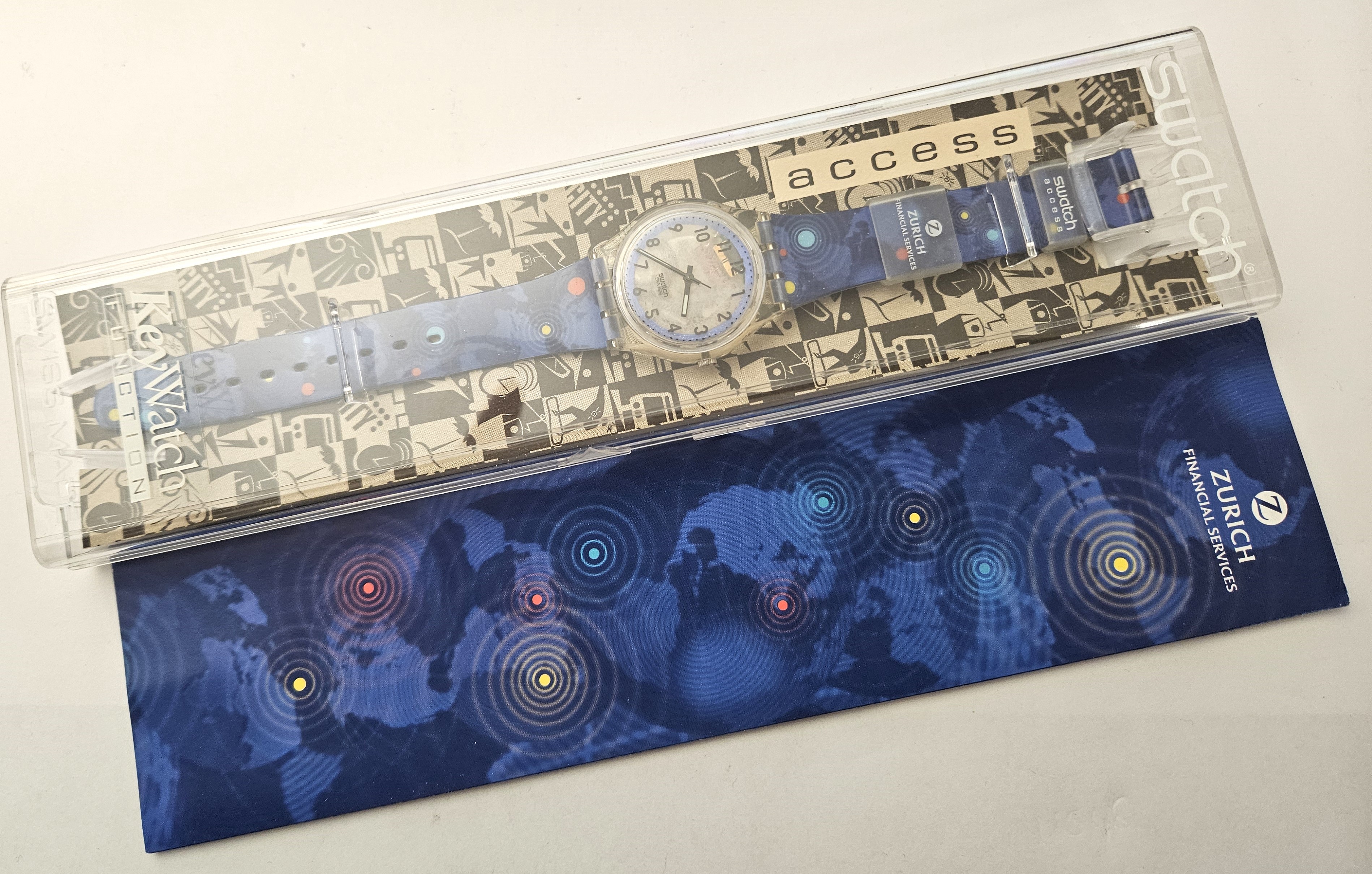 Swatch Special Access 1998 - SKK103Z - Clearance (Adelbolden) Zurich - Nuovo - In occasione della fondazione Zurich Financial Services - perfettamente funzionante nella sua custodia originale - Display analogico - Resistente all'acqua fino a 3 Bar - Tipo di movimento Quarzo Svizzero - Cassa e Cinturino in Plastica
