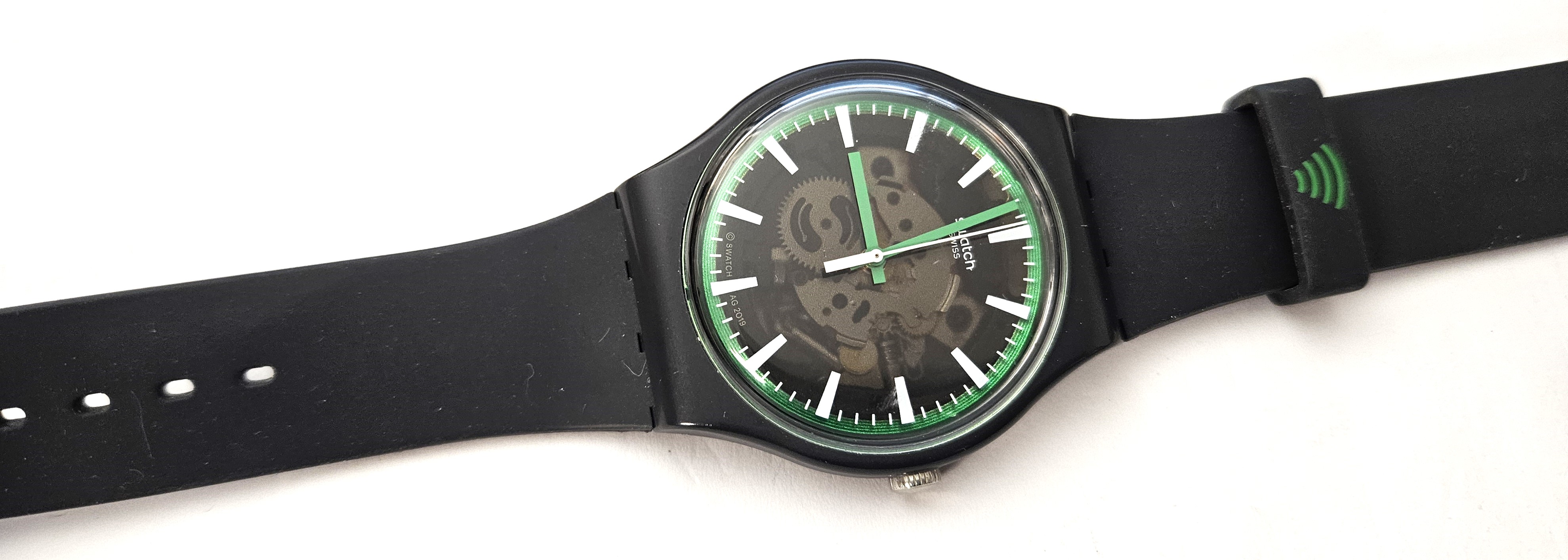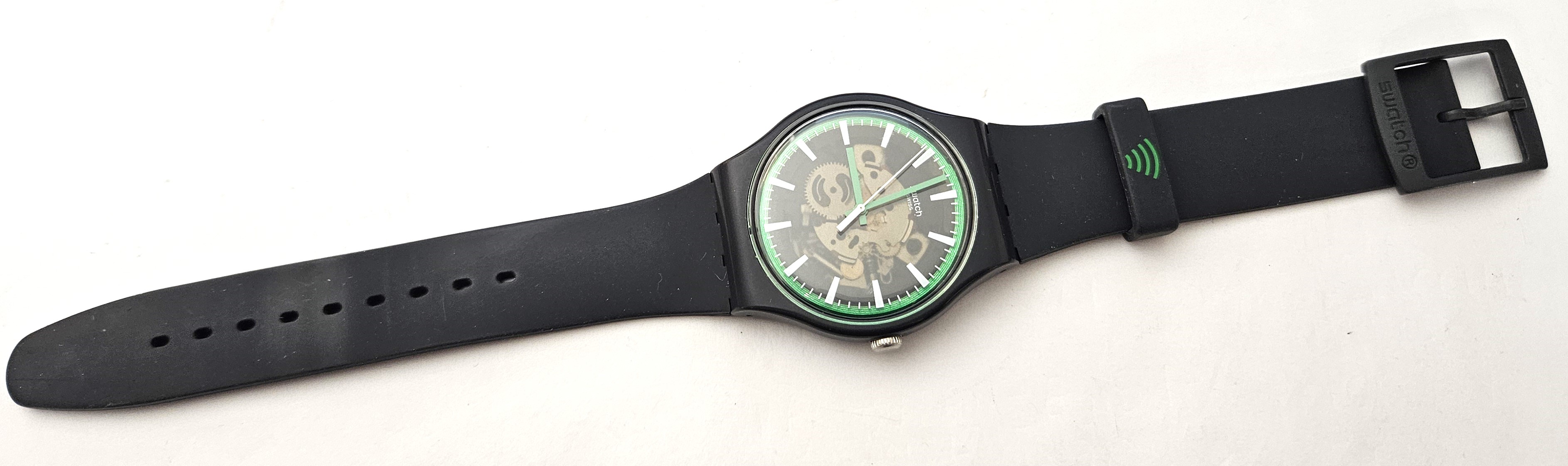 Swatch Special Swatch pay 2020 - SVIM100-5300 - Graphite pay - Leggermente usato SwatchPAY! perfettamente funzionante senza la sua confezione originale - Display analogico - Resistente all'acqua fino a 3 bar - Tipo di movimento Quarzo Svizzero - Cassa in plastica e Cinturino in silicone -