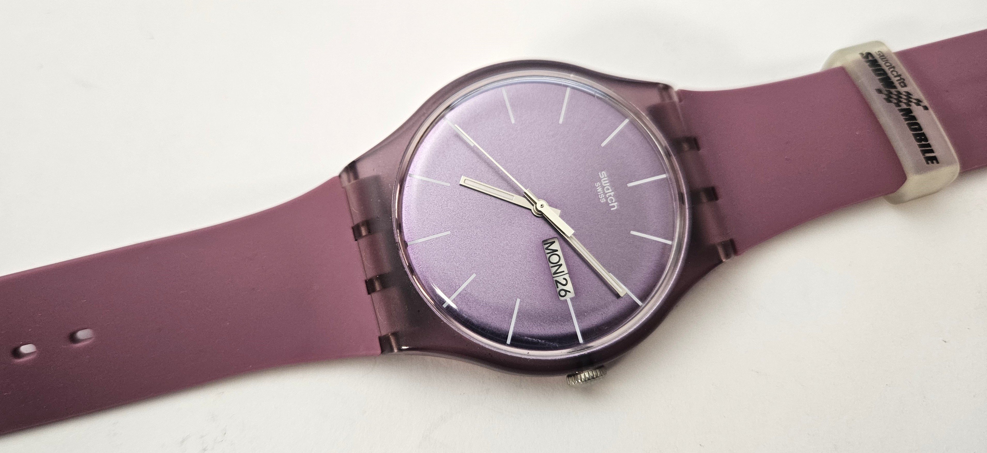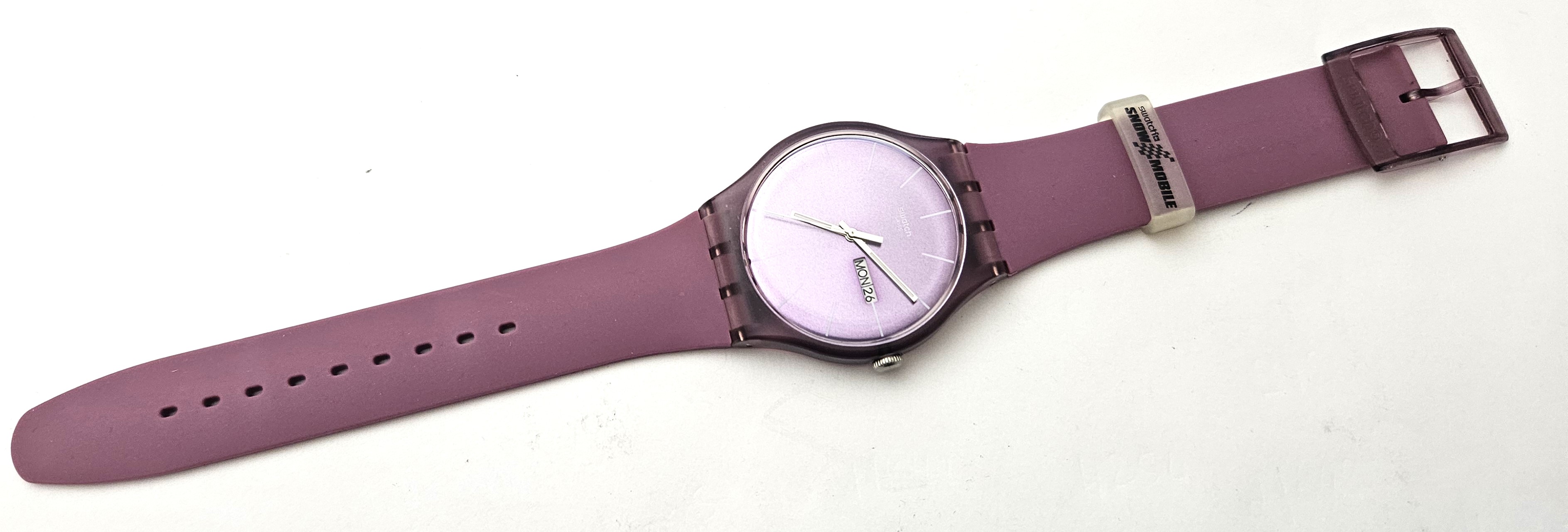 Swatch New Gent 2011 - SUOR703 - Snow mobile Saalbach (Prune Rebel) - Leggermente usato - perfettamente funzionante senza la sua custodia originale - Display analogico - Resistente all'acqua fino a 3 Bar - Tipo di movimento Quarzo Svizzero - Cassa e Cinturino in silicone -
