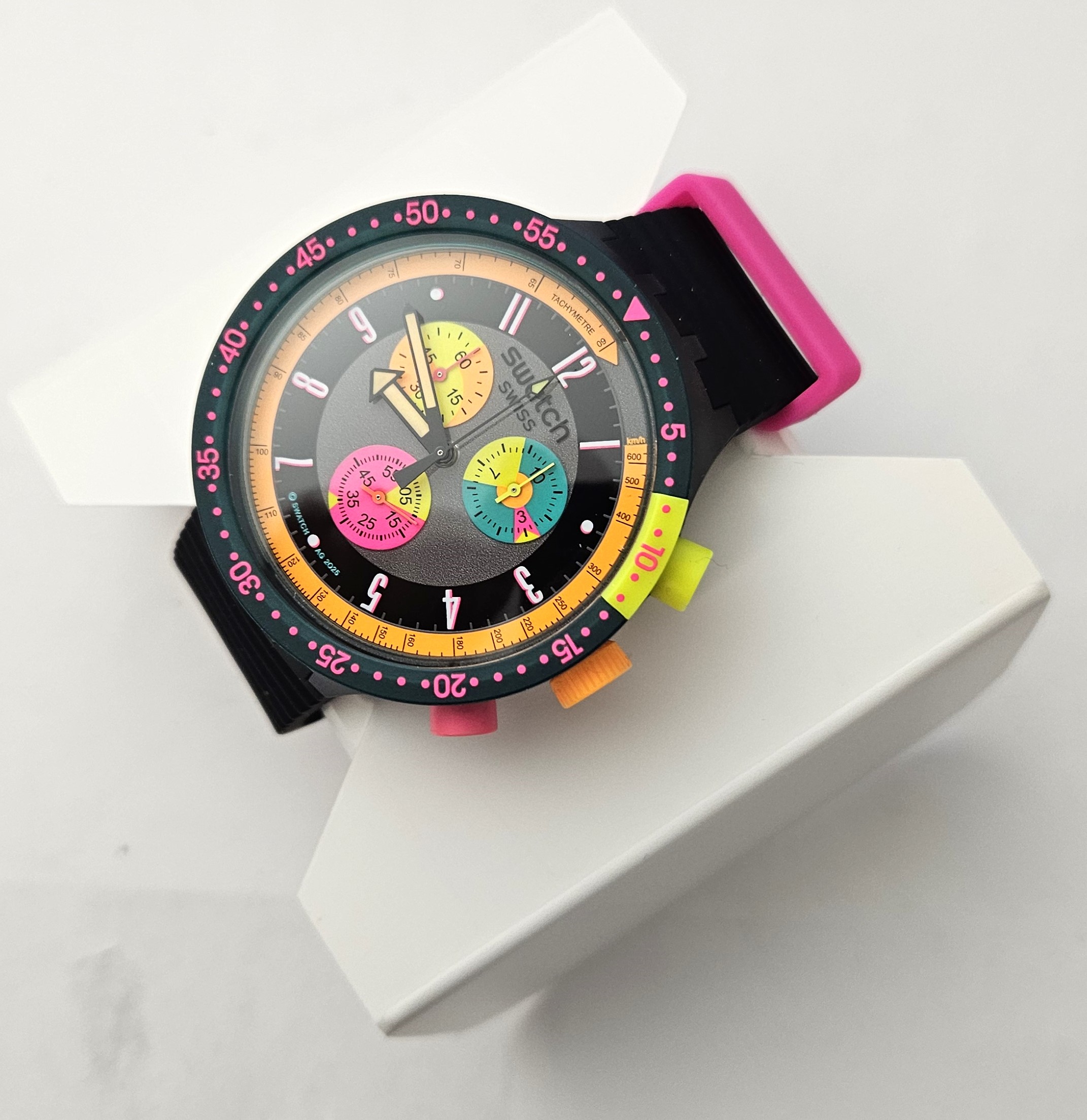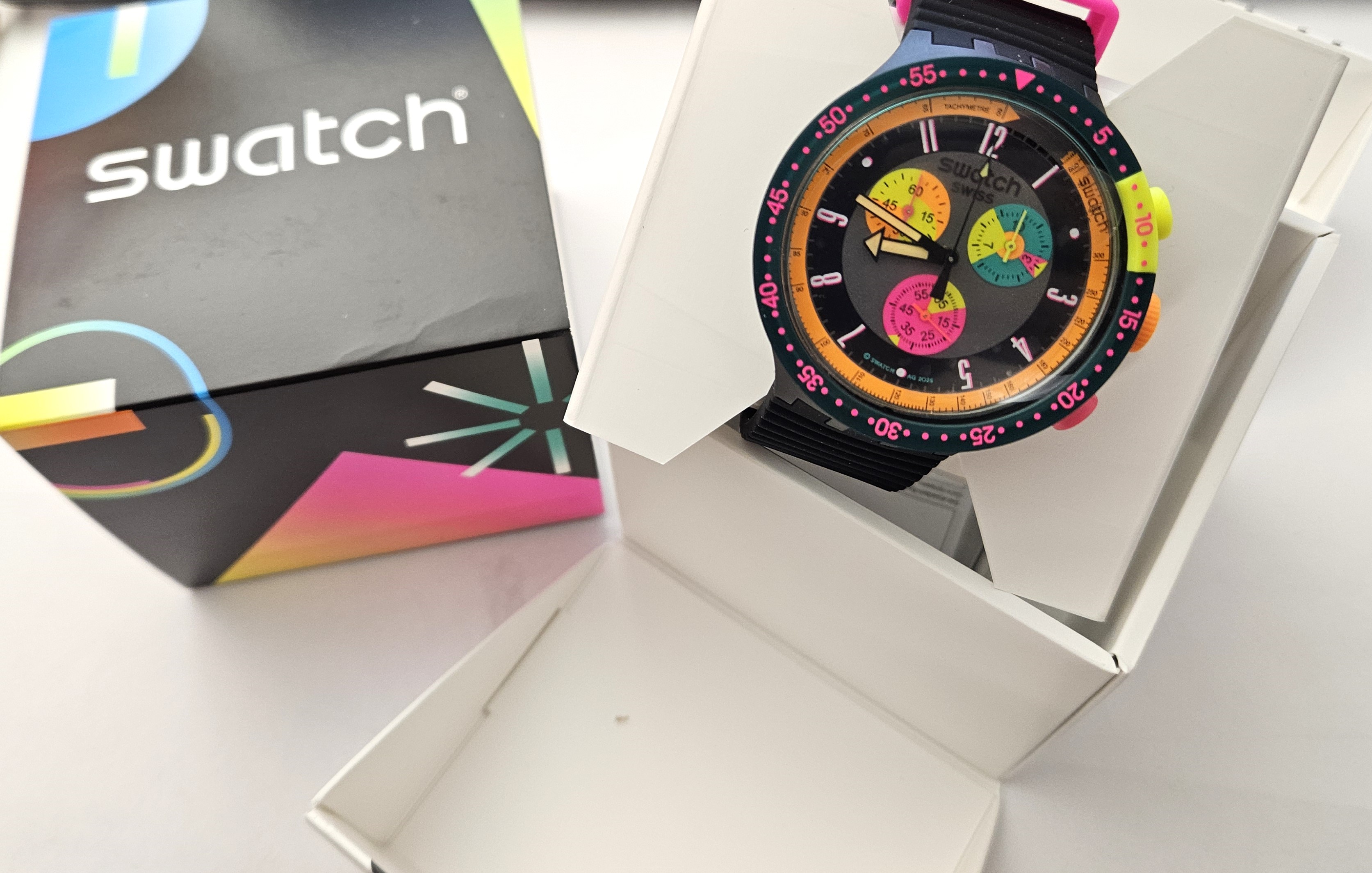 Swatch Big Bold chrono 2025 - SB02B104 - Neon seppia - Nuovo - perfettamente funzionante completo della sua custodia originale - funzione cronografo - cassa in plastica con cinturino in silicone - Display Analogico - Resistente all'acqua fino a 3 Bar
