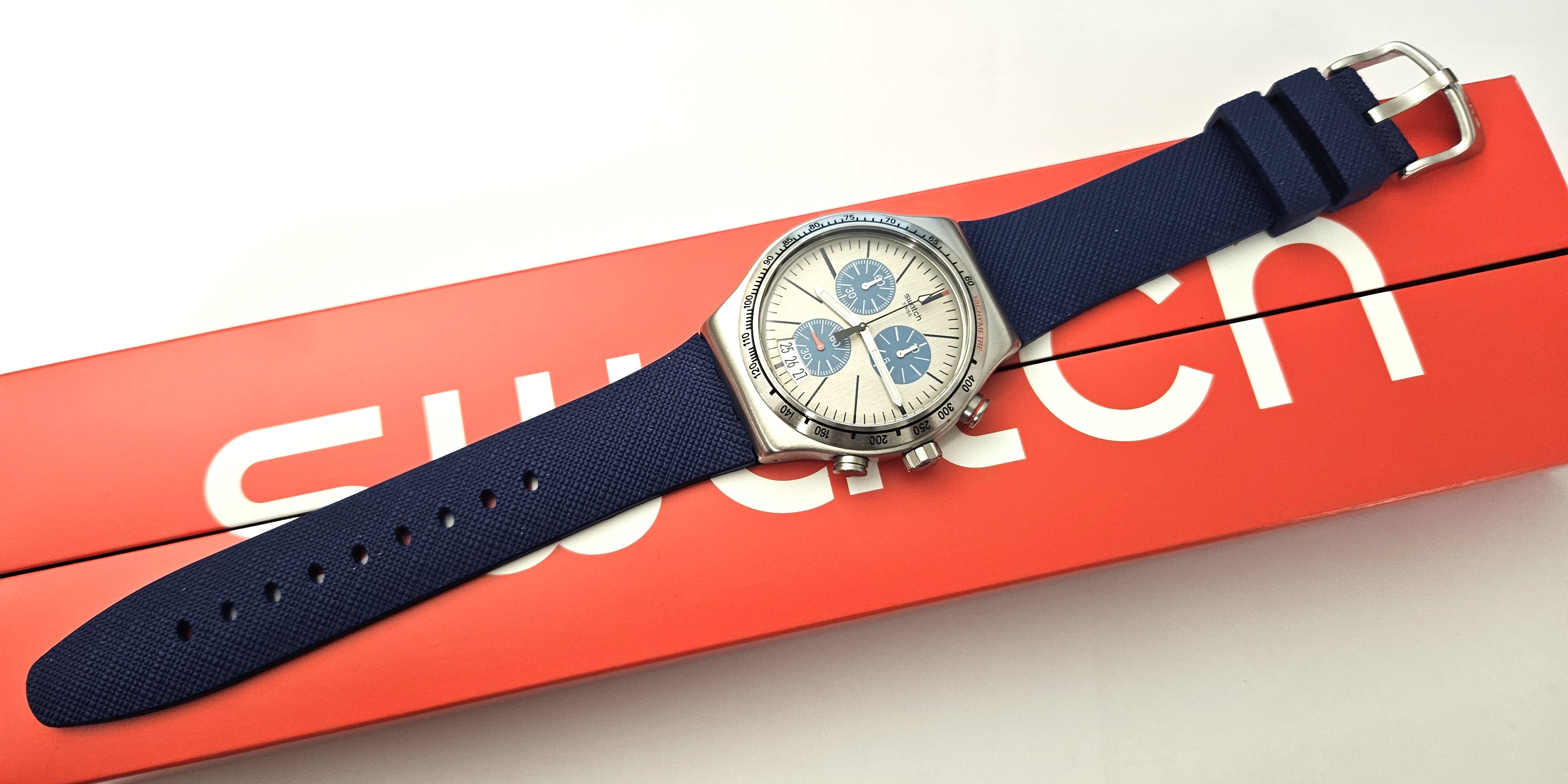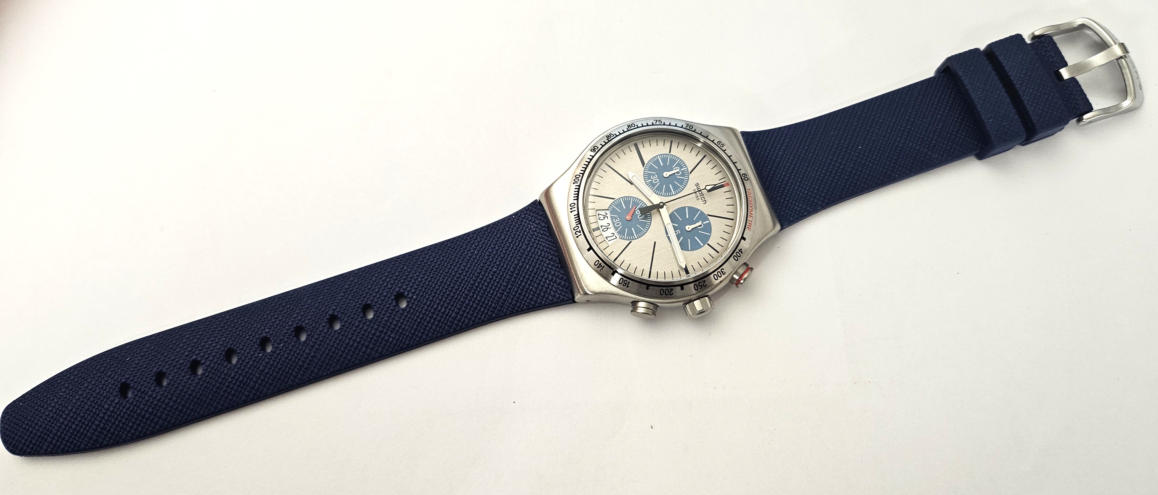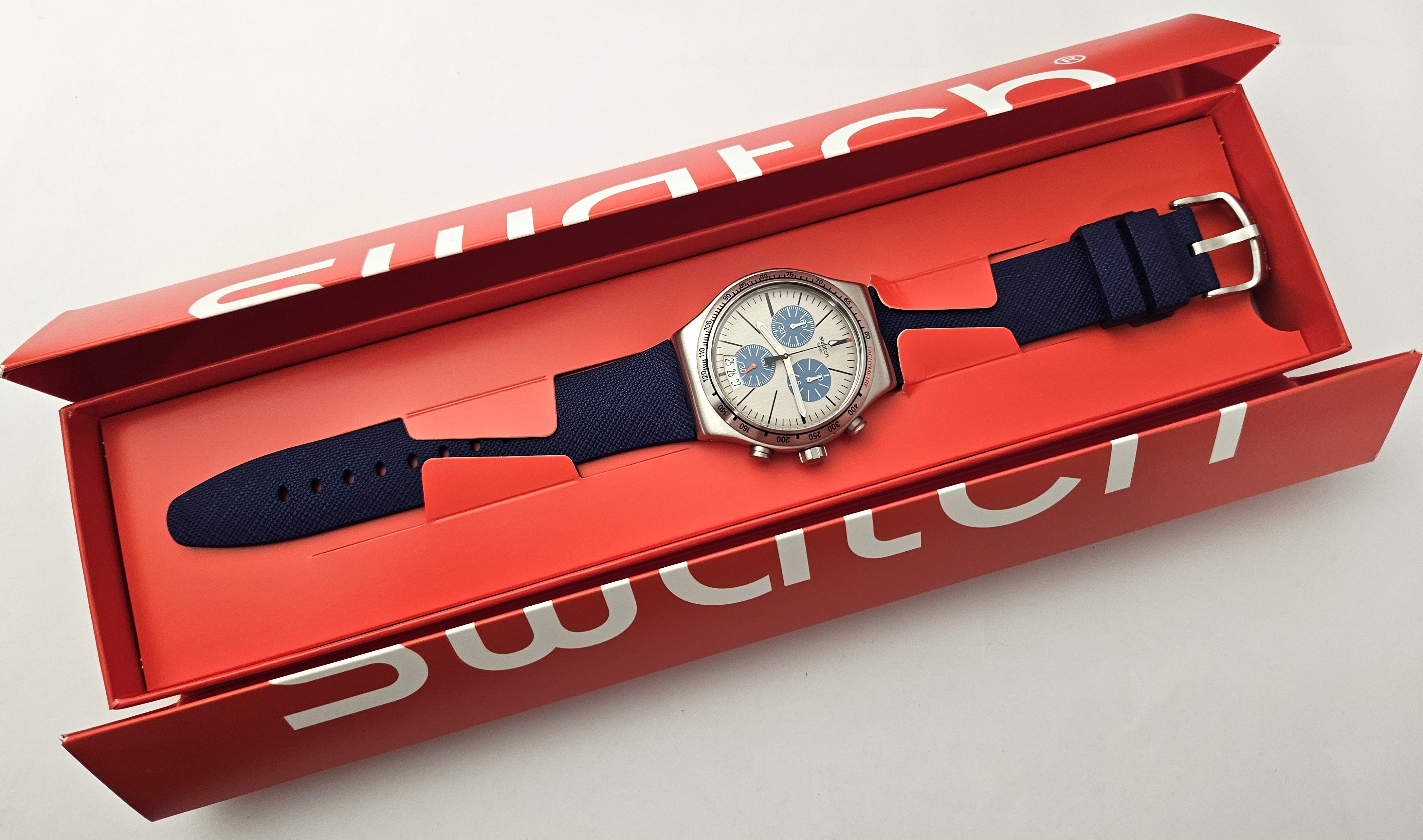 Swatch Irony Chrono 2016 - YVS435 - Blau me on - Nuovo - perfettamente funzionante completo della sua custodia originale - diametro cassa 43 mm - Display Chronografo - Resistente all'acqua fino a 3 bar - Tipo di movimento Quarzo Svizzero