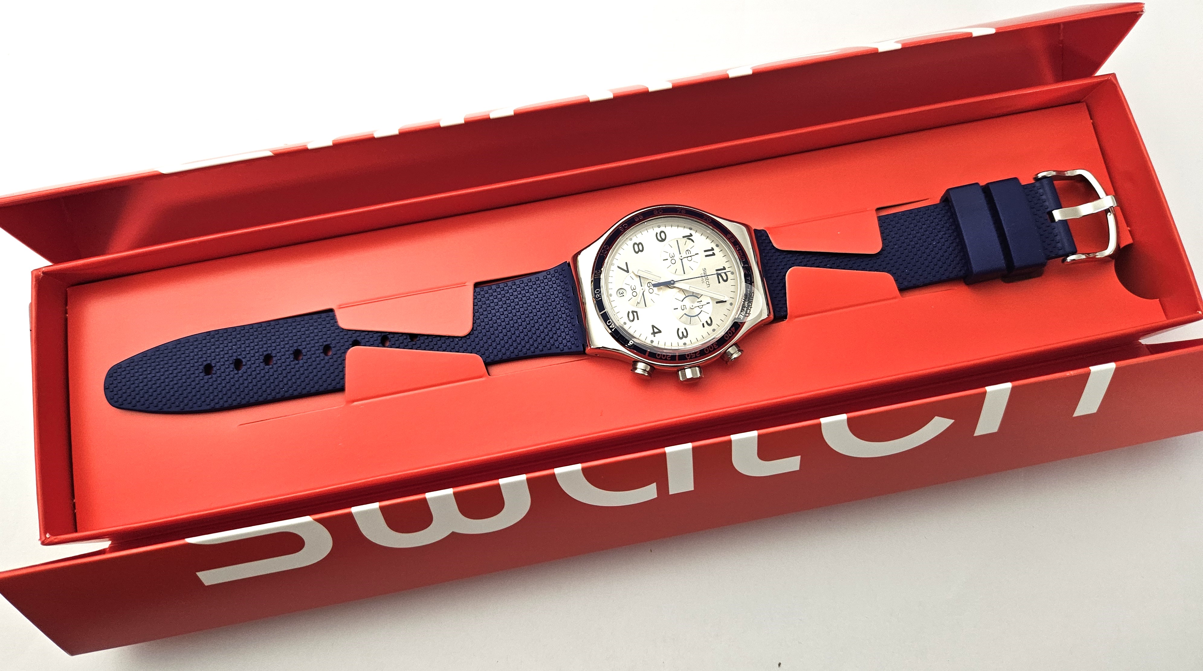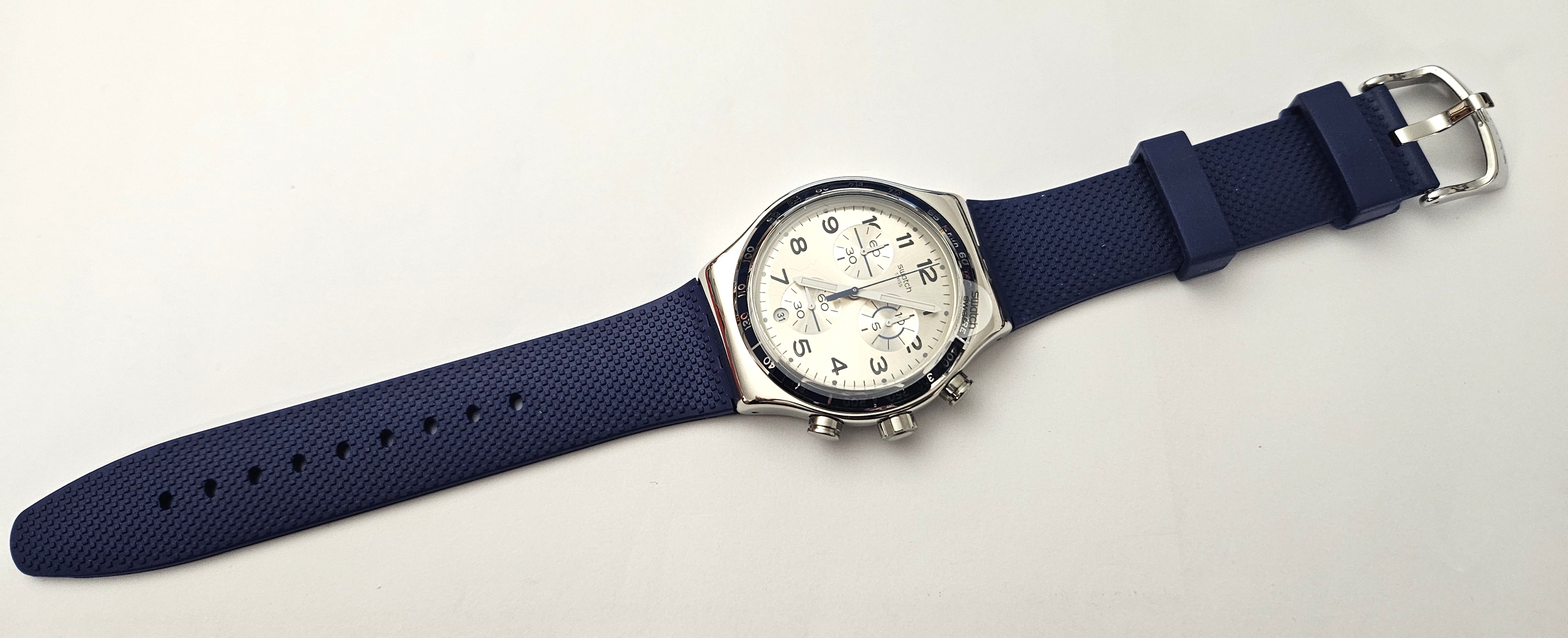 Swatch Irony Chrono 2016 - YVS439 - Fresco Azul - Nuovo - perfettamente funzionante completo della sua custodia originale - diametro cassa 43 mm - Display Chronografo - Resistente all'acqua fino a 3 bar - Tipo di movimento Quarzo Svizzero