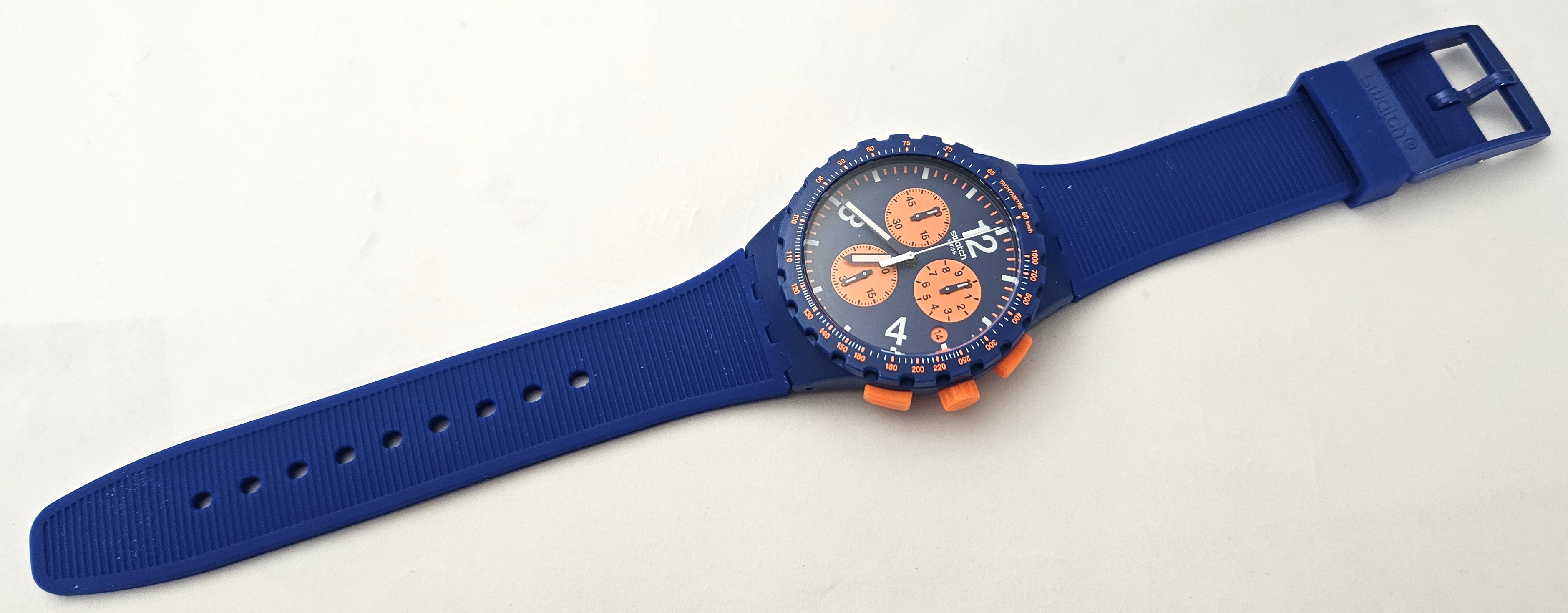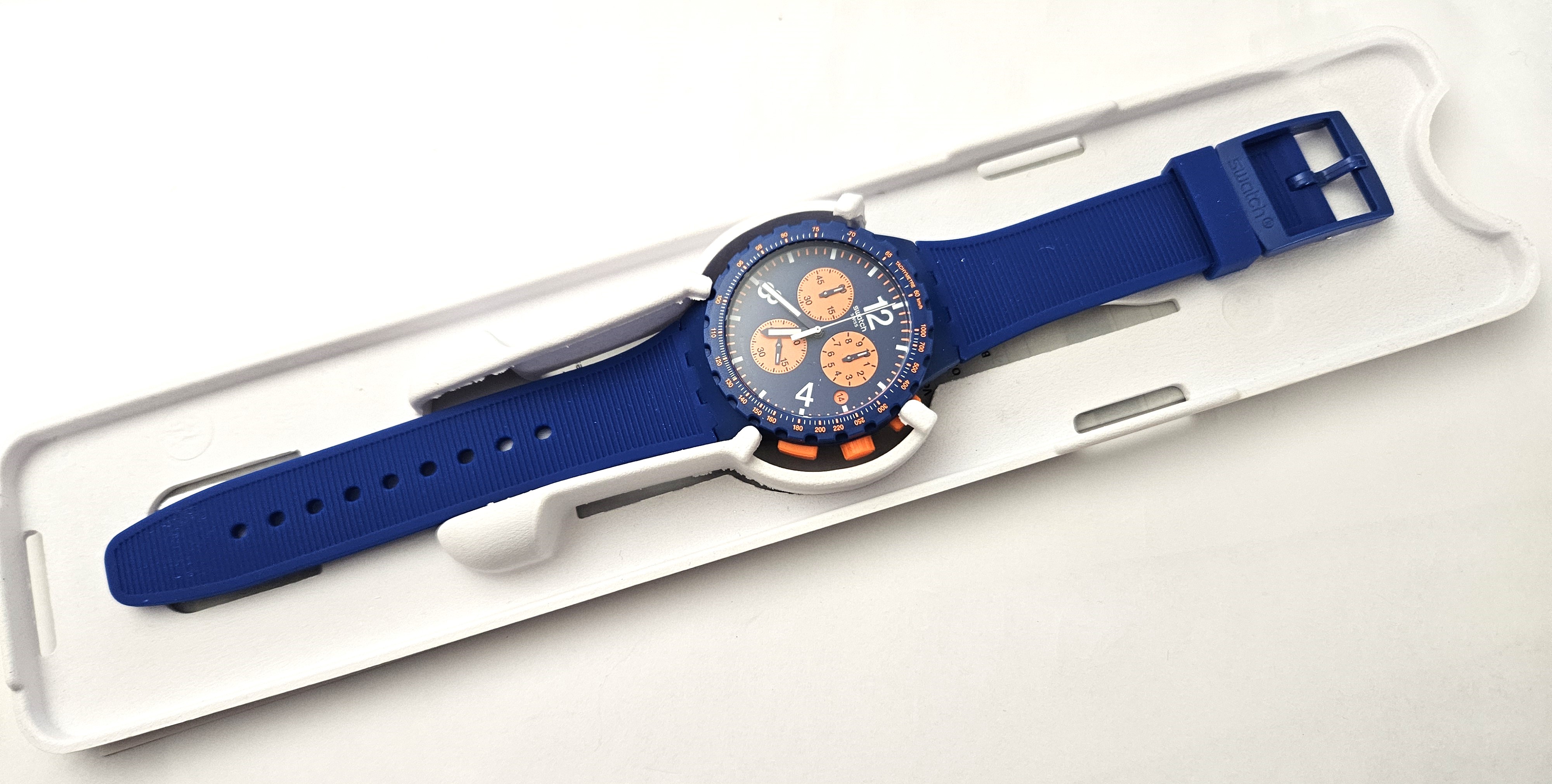 Swatch Chrono 2019 - SUSN419 - Primarily blue - Nuovo - diametro cassa 42 mm - perfettamente funzionante nella sua custodia originale - Display analogico - Resistente all'acqua fino a 3 Bar - Tipo di movimento Quarzo Svizzero - Cassa in plastica e Cinturino in Silicone -