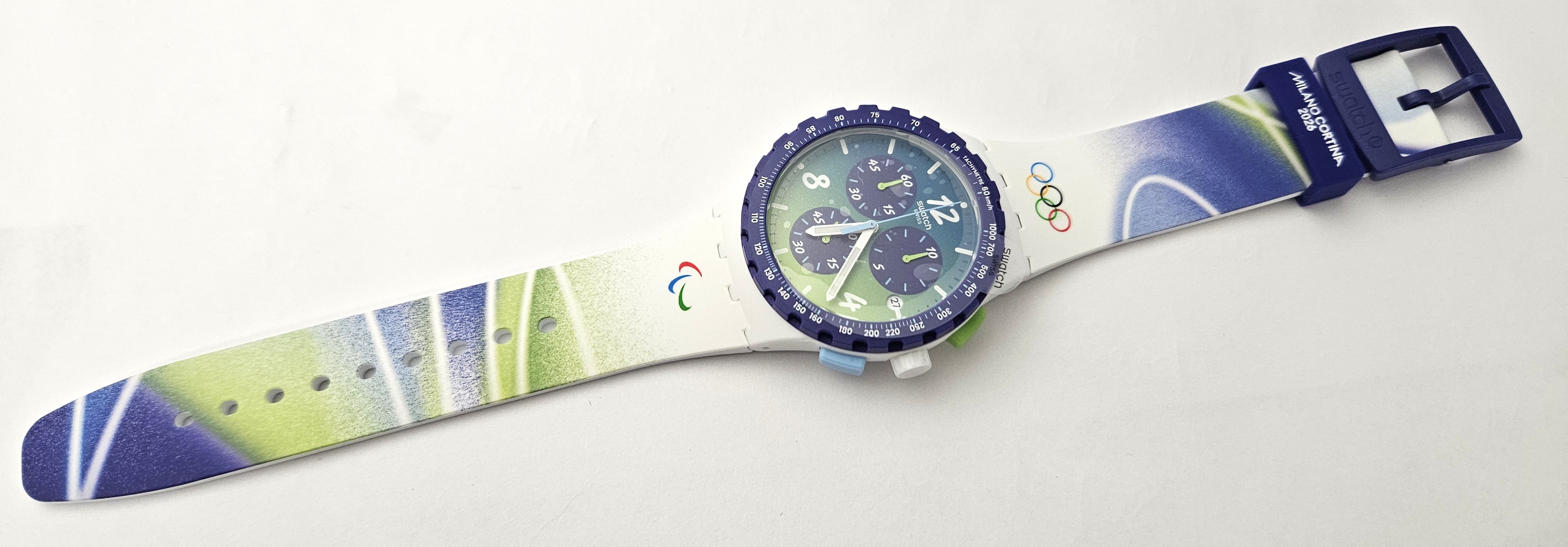 Swatch Special Chrono 2025 - SUSZ403 - Snowy Slopes Olympic Games Milano Cortina 2026 - Nuovo - diametro cassa 42 mm - perfettamente funzionante nella sua custodia originale - Display analogico - Resistente all'acqua fino a 3 Bar - Tipo di movimento Quarzo Svizzero - Cassa in plastica e Cinturino in Silicone -
