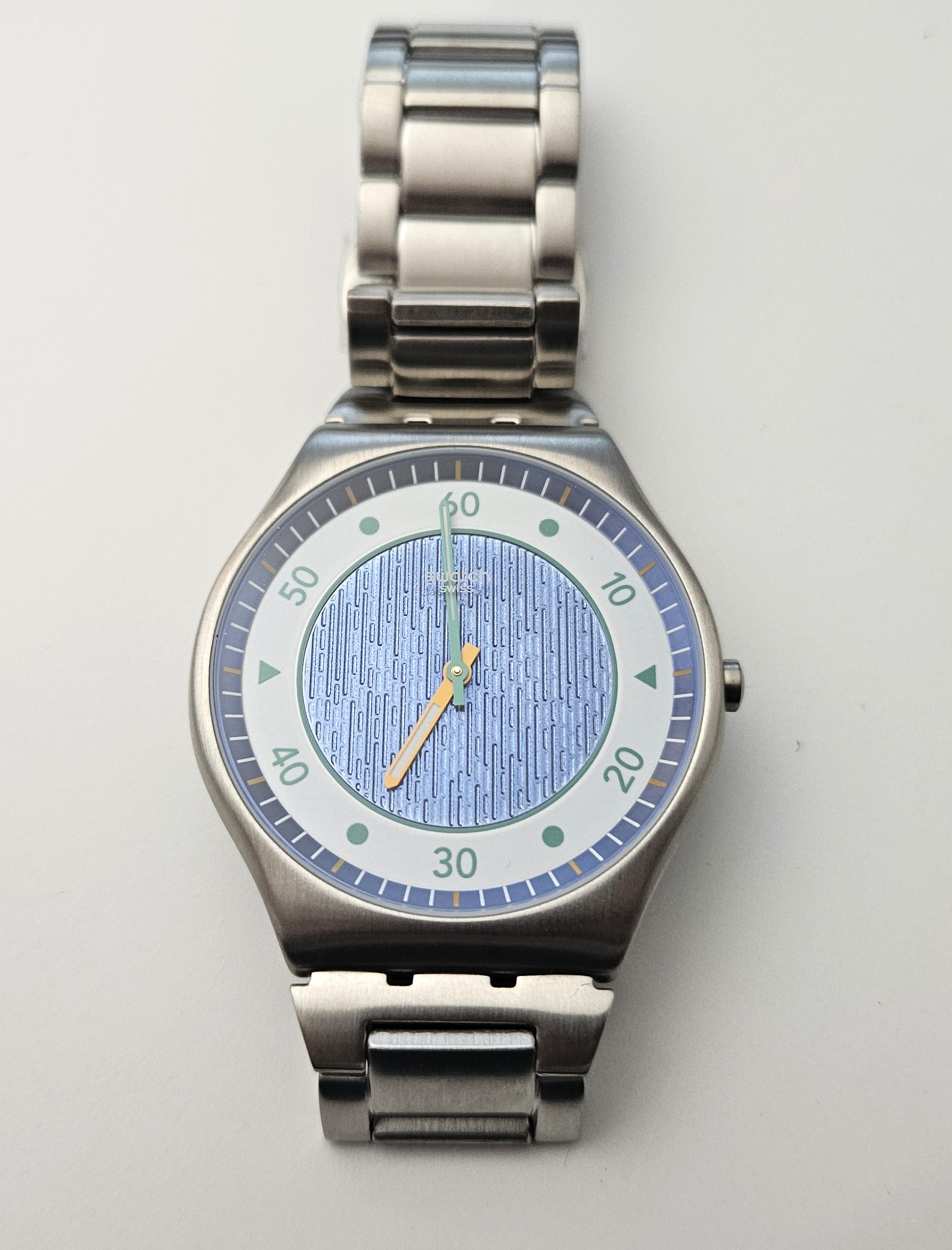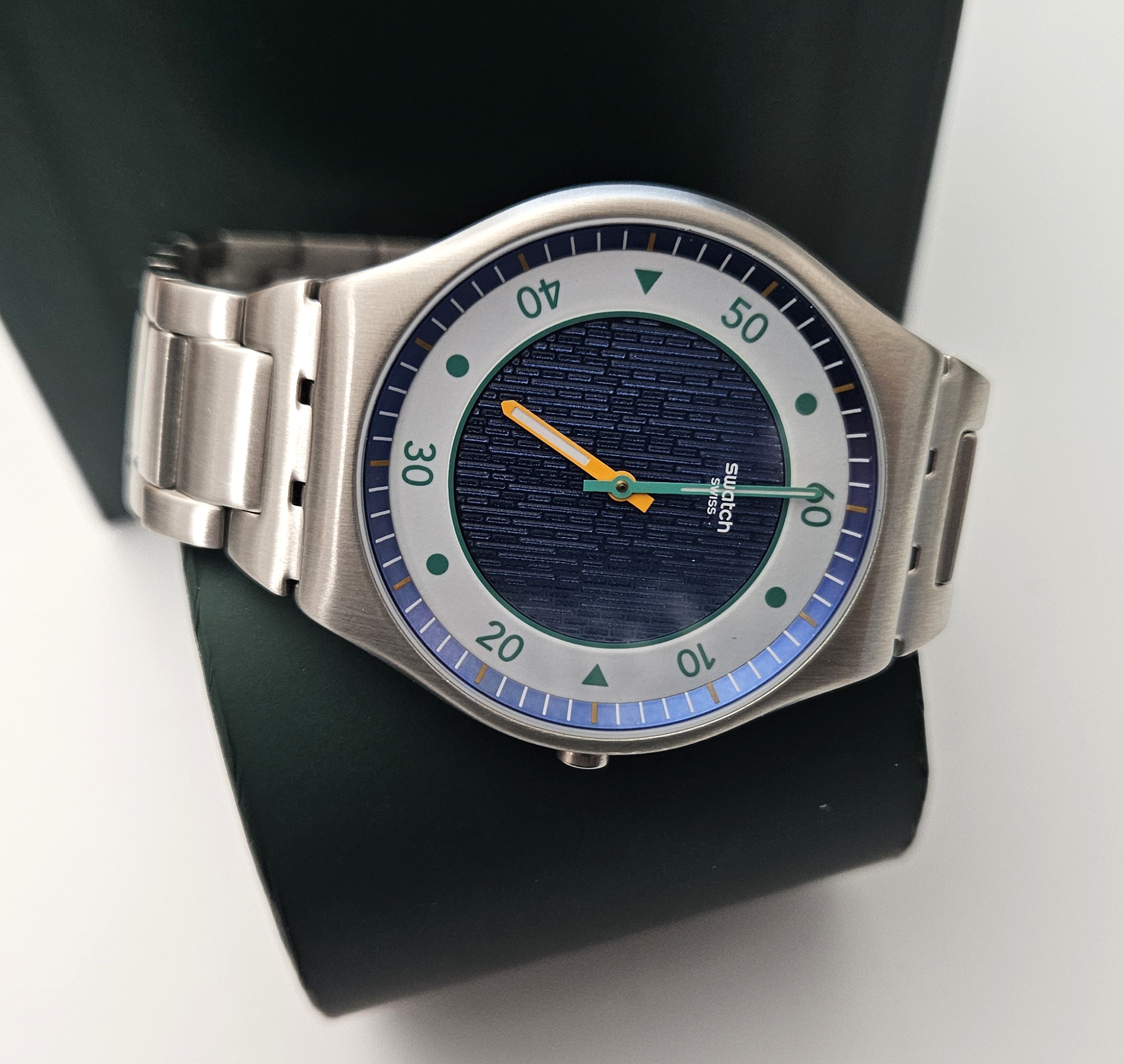 Swatch Irony Skin 2023 - SS07S143G - Splash Dance - Nuovo - perfettamente funzionante nella sua custodia originale - Display analogico - Resistente all'acqua fino a 3 Bar - Tipo di movimento Quarzo Svizzero - Cassa in acciaio e cinturino in acciaio - diametro cassa 42 mm .