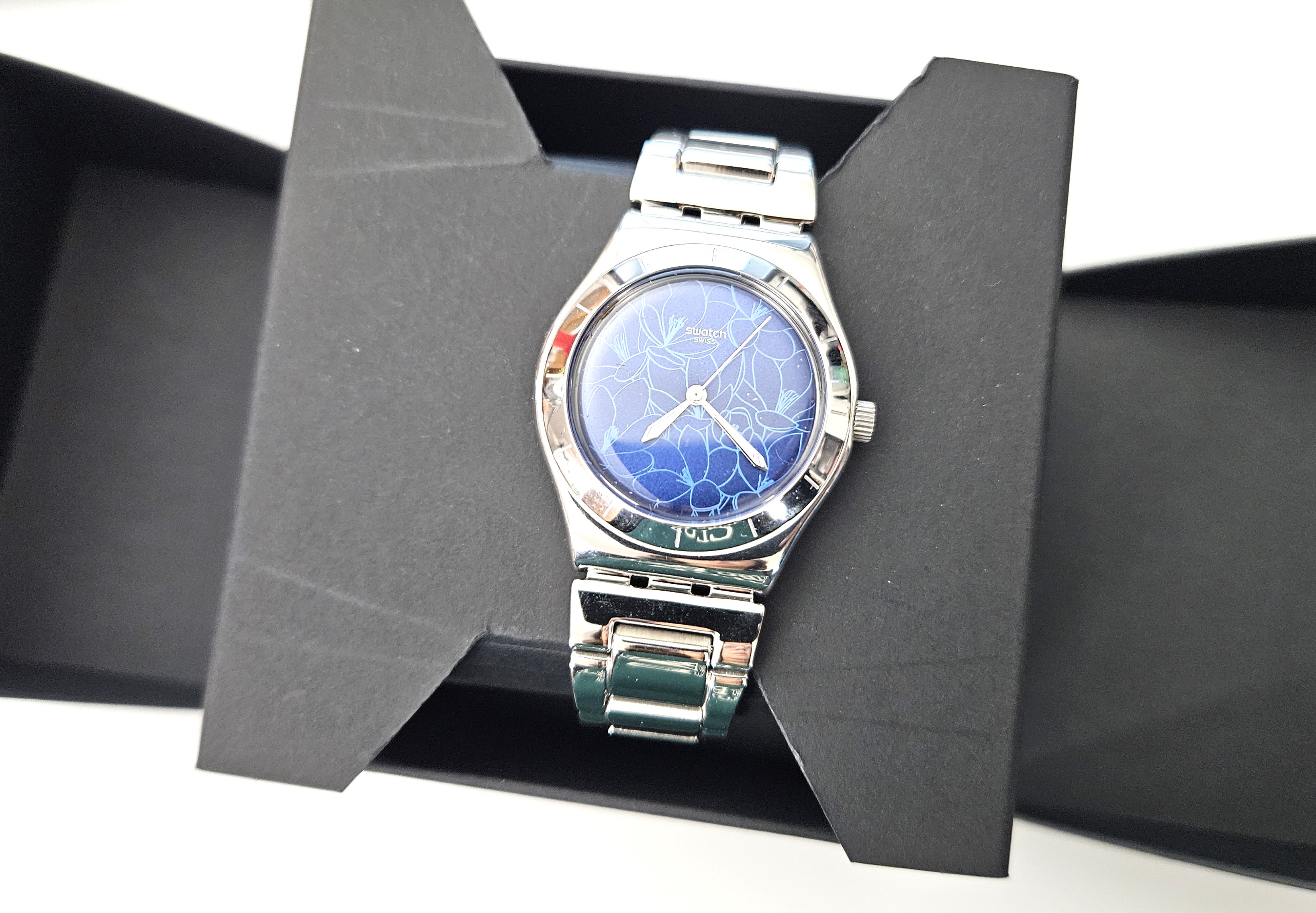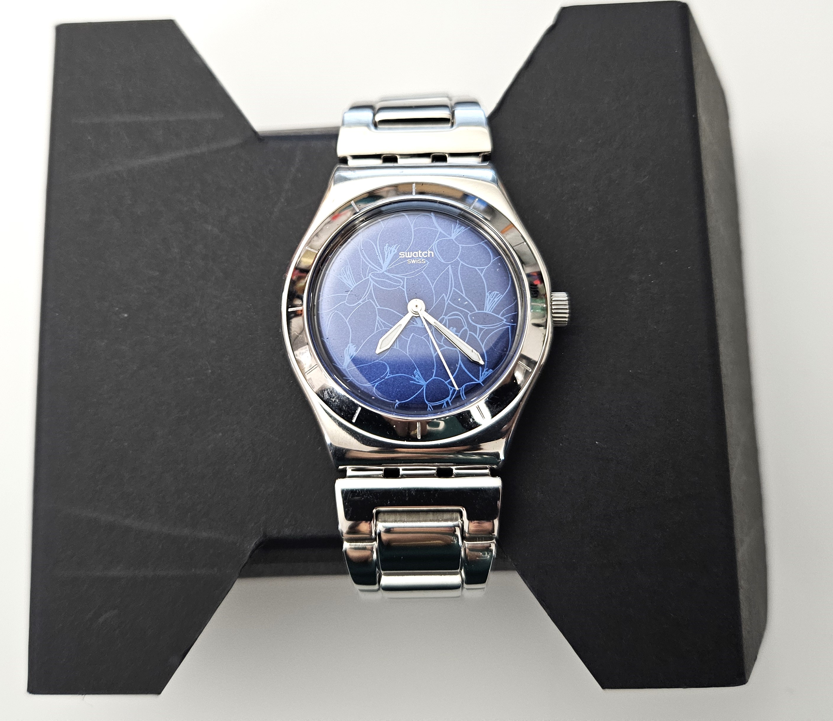 Swatch Irony Medium 2023 - YLS235G - Blue Petal Promise - NUOVO - diametro cassa 33 mm - perfettamente funzionante nella sua custodia originale - Display analogico - Resistente all'acqua fino a 3 bar - Tipo di movimento Quarzo Svizzero - cassa in acciaio e cinturino in acciaio -