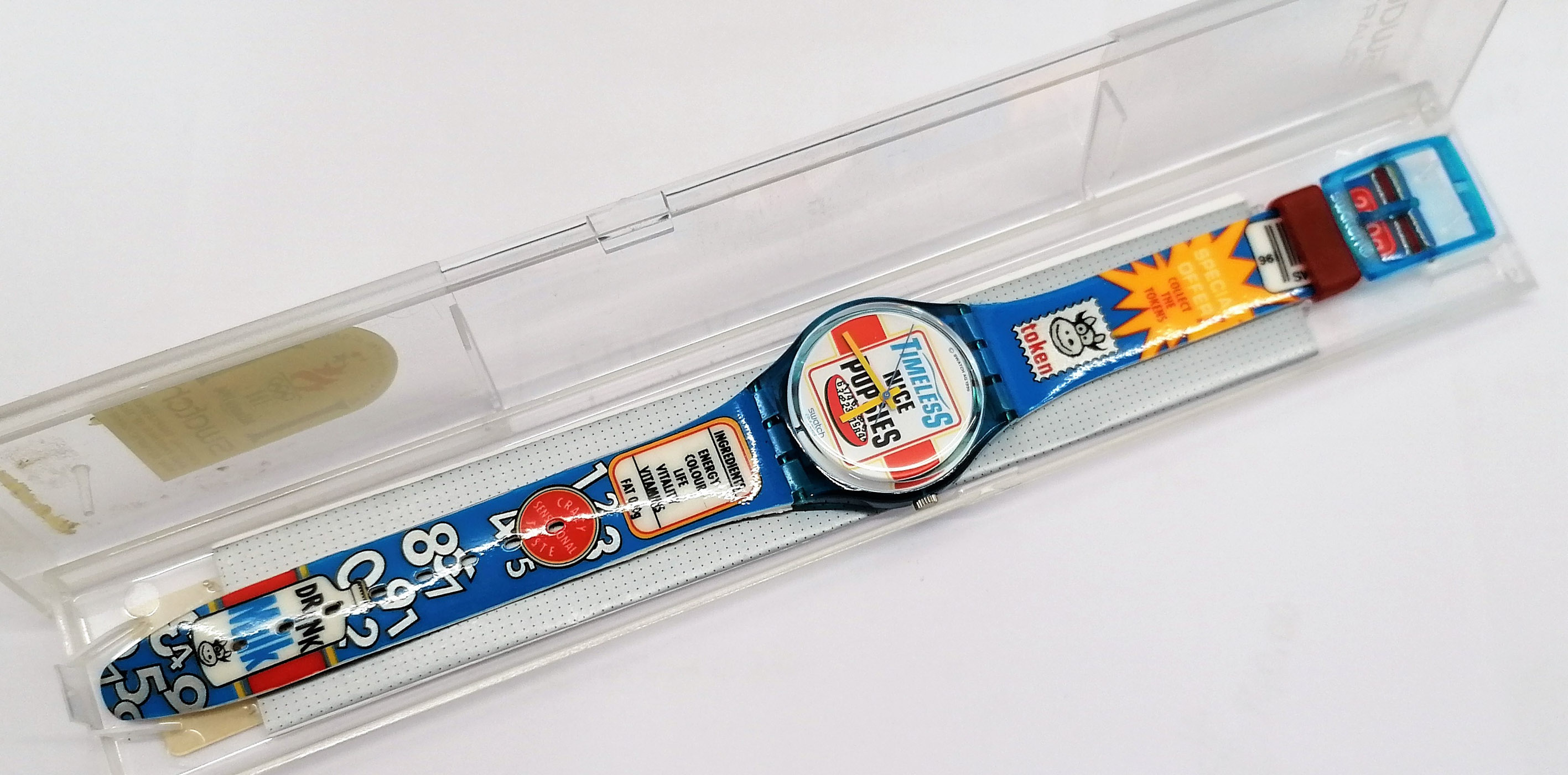 Swatch Standard anno 1996 - GN156 - Good Morning - NUOVO - perfettamente funzionante nella custodia originale - Display analogico - Resistente all'acqua fino a 3 bar - Tipo di movimento Quarzo Svizzero - Cassa e Cinturino in Plastica