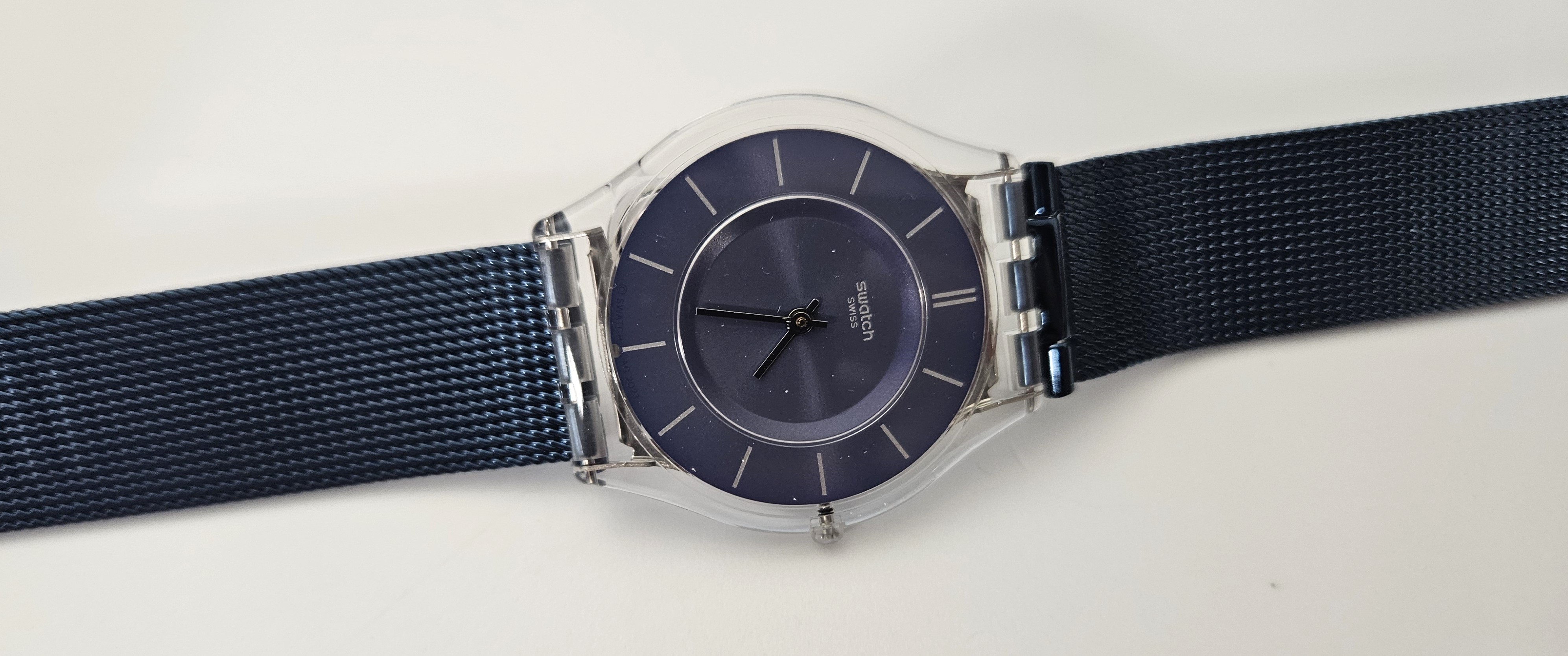 Swatch Skin 2024 - SS08K120S - Cool Skies - Nuovo - perfettamente funzionante - completo di scatola originale e batteria - diametro cassa 34 mm - Display Analogico - Resistente all'acqua fino a 3 bar - Tipo di movimento Quarzo Svizzero - cassa bio-sources e cinturino in metallo a maglia milanese -