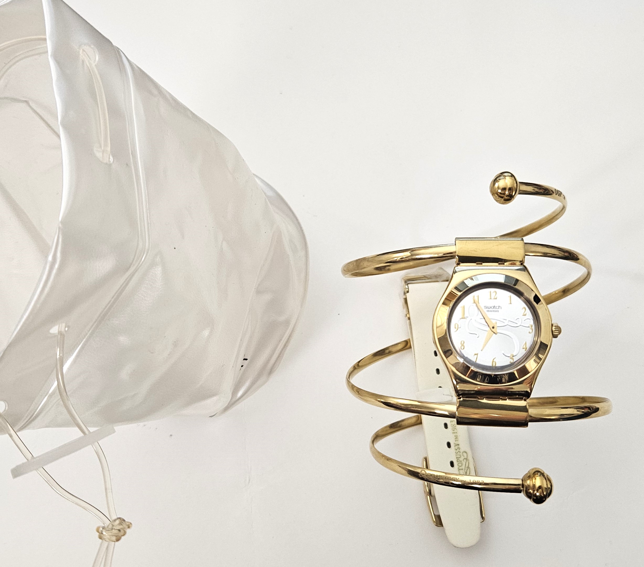 Swatch Special Irony Medium 2002 - YLG115H - Octopussy (Collezione James Bond) - NUOVO - perfettamente funzionante nella sua custodia originale - senza cartone esterno - Display analogico - Resistente all'acqua fino a 3 bar - Tipo di movimento Quarzo Svizzero - Cassa e cinturino in acciaio inossidabile - è compreso anche il cinturino in pelle originale