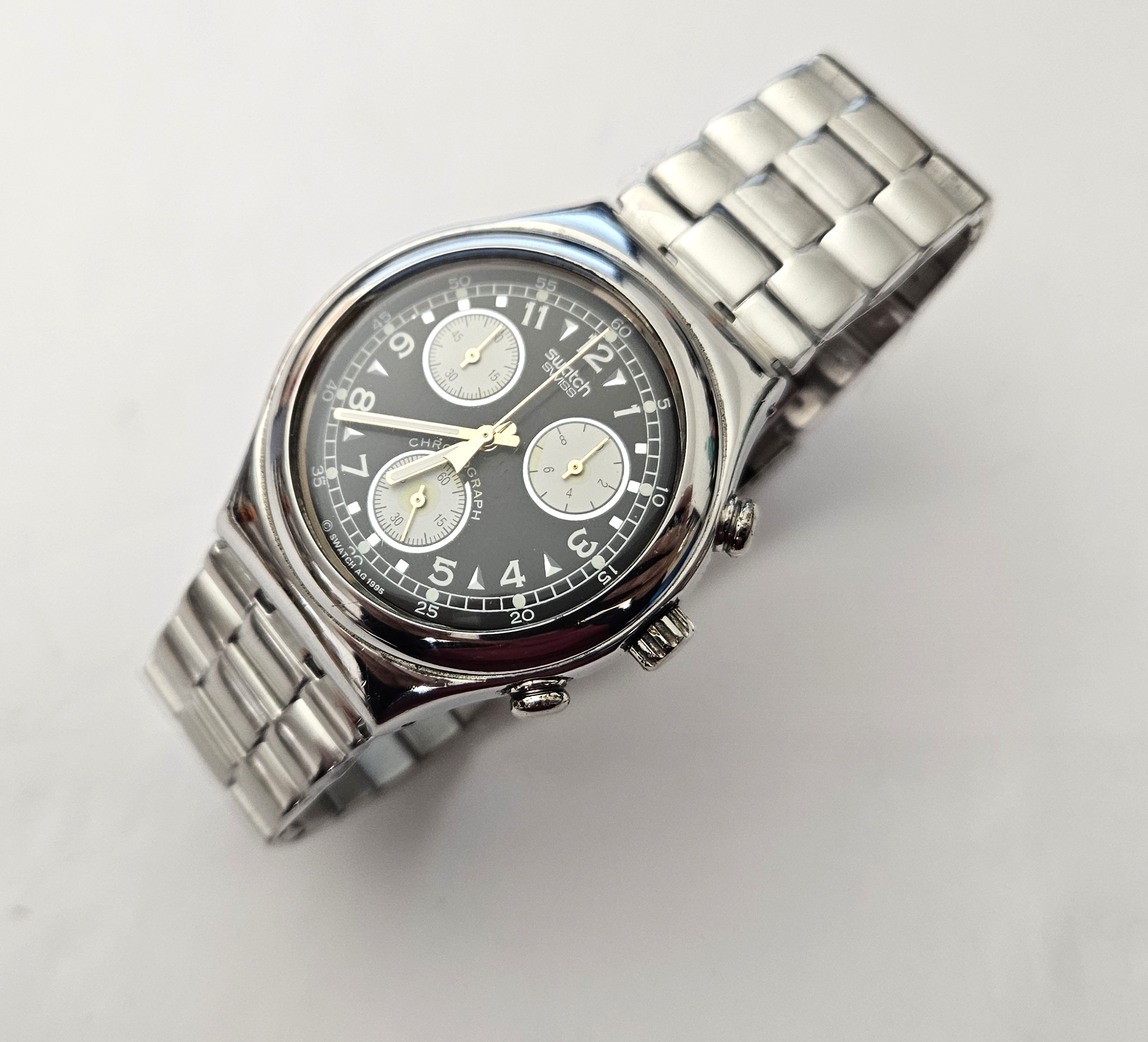 Swatch Irony Chrono - YCS101 - Vernissage - Leggermente Usato con Cinturino Nuovo in acciaio - perfettamente funzionante nella sua custodia originale - Display Analogico - Resistente all'acqua fino a 3 bar - Tipo di movimento Chronografo - Movimento del marchio ETA