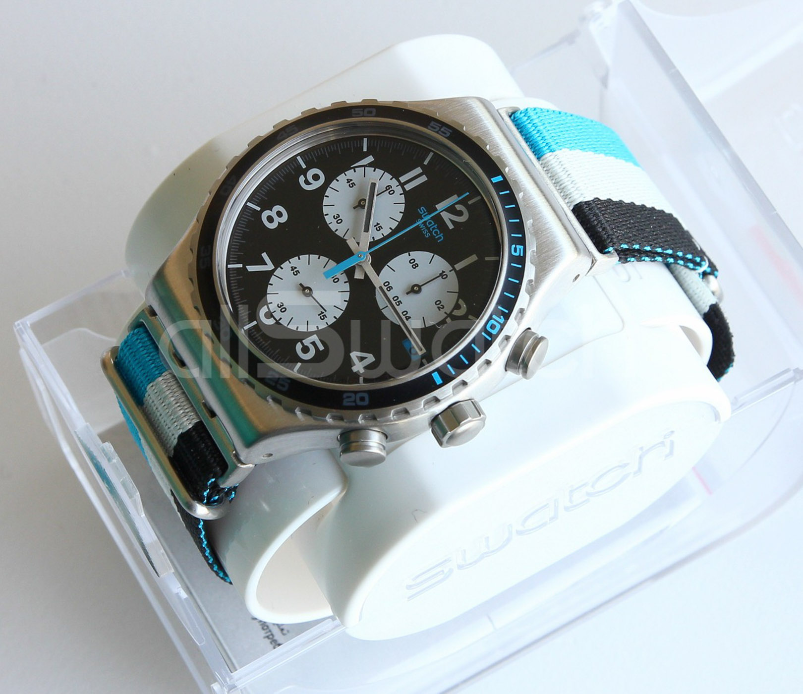 Swatch Irony Chrono - YVS409 - Skybond - NUOVO - perfettamente funzionante nella sua custodia originale - Display Chronografo - Resistente all'acqua fino a 3 bar - Tipo di movimento Quarzo Svizzero - Cassa in acciaio e Cinturino in Tela