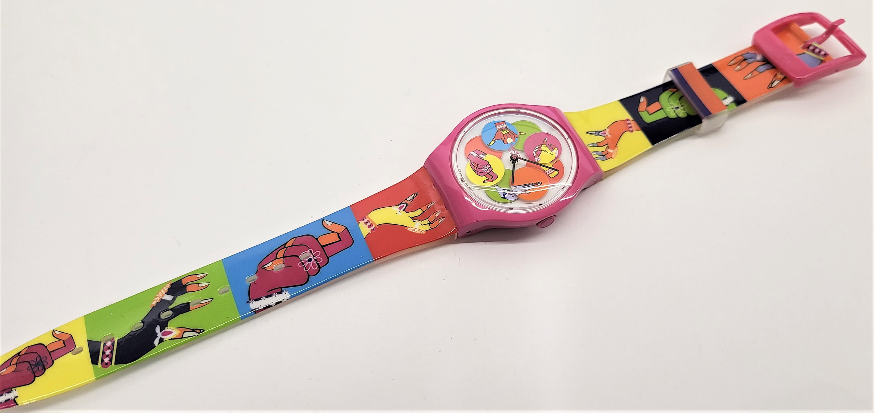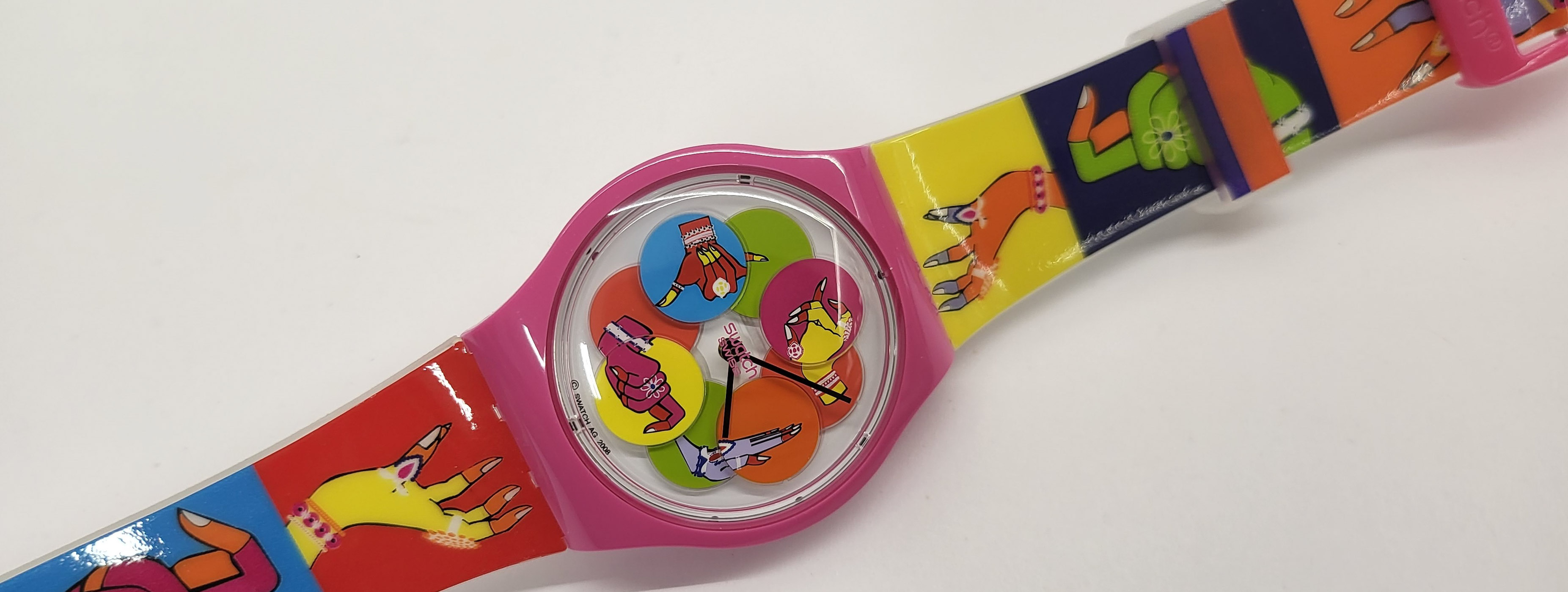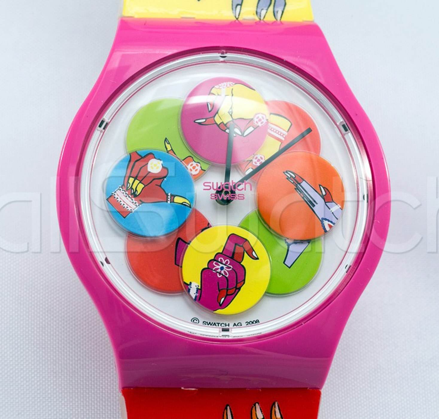 Swatch Special - SUPP101 - Dancing Hands - NUOVO - perfettamente funzionante nella sua custodia originale - collezione Primavera/Estate 2009 - Display analogico - Resistente all'acqua fino a 3 bar - Tipo di movimento Quarzo Svizzero - Cassa e Cinturino in Plastica - La danza delle ore firmata Manish Arora. Questo affascinante Swatch Puzzle Motion è un colorato tributo all’arte della danza attraverso i primi piani di mani in movimento, ingioiellate e dipinte. Il primo strato del cinturino presenta una colonna di riquadri colorati, ognuno dei quali esibisce una mano immortalata in un gesto stilizzato. Le mani multicolori indossano anelli e bracciali. Il cinturino è abbinato a fibbia e cassa di solida plastica rosa, che circonda il quadrante a più livelli: due set di dischi rotanti in plastica sono montati su una base bianca. Ogni disco presenta il primo piano di una mano ingioiellata e colorata, adagiata su uno sfondo anch’esso colorato. I colori del cinturino sono ripresi sul quadrante. Mentre percorrono il ciclo di 12 ore i dischi ruotano e le mani colorate si combinano dando vita a una magica danza. Assenti i numeri e gli indici. Sottili lancette nere per le ore e i minuti segnano lo scorrere del tempo.