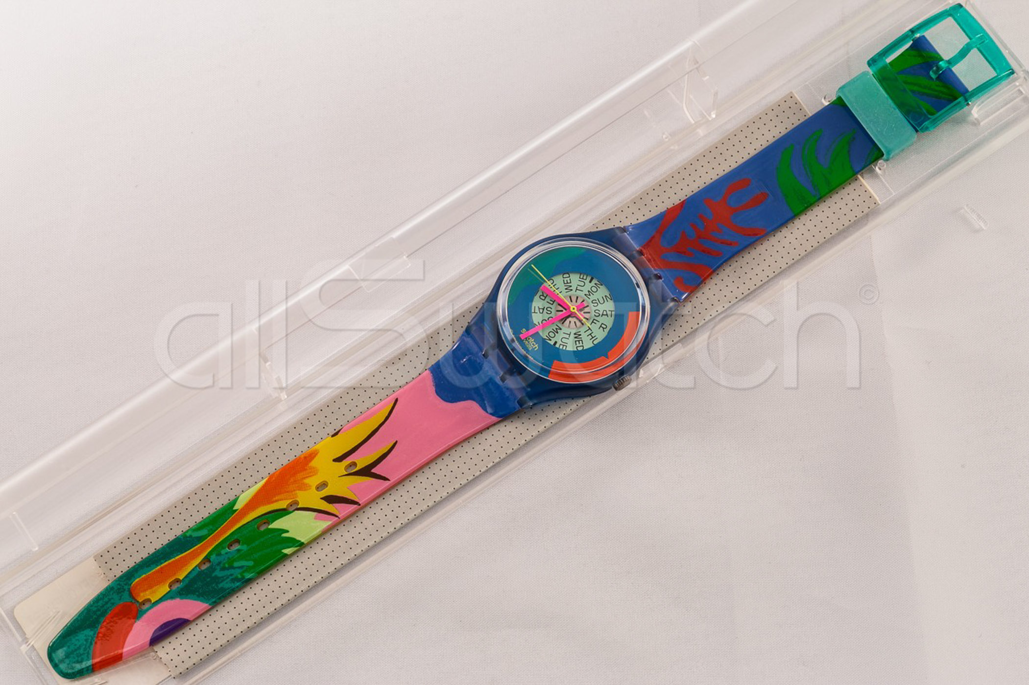 Swatch Standards 1990 - GN703 - Passion Flower - Nuovo - perfettamente funzionante nella sua custodia originale - Molto bello da collezionare ma non adatto ad essere utilizzato perchè il cinturino si spacca facilmente - Display analogico - Resistente all'acqua fino a 3 Bar - Tipo di movimento Quarzo Svizzero - Cassa e Cinturino in Plastica