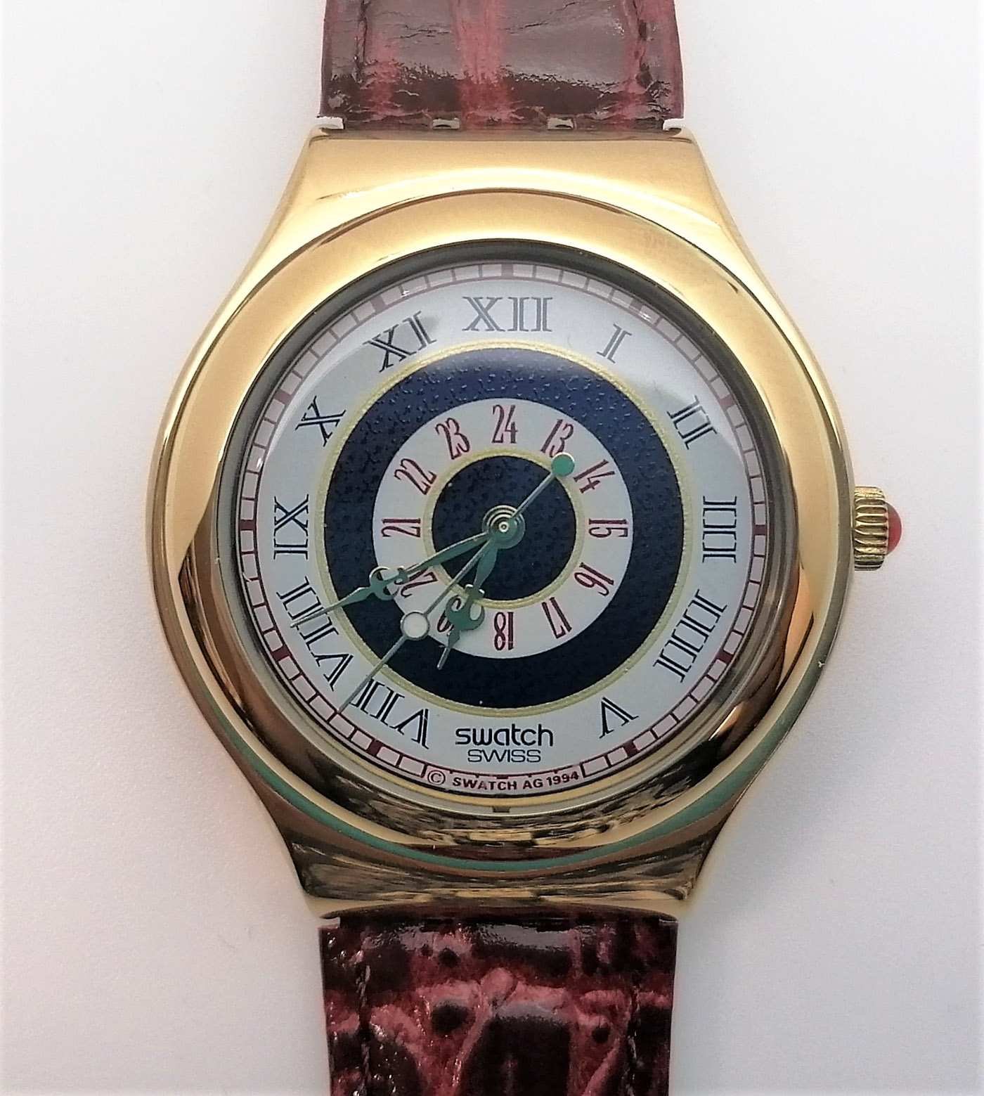 Swatch Irony 1995 - YGG102 - Sangue Blu - NUOVO - versione americana con cinturino elastico - perfettamente funzionante nella sua custodia originale - Display analogico - Resistente all'acqua fino a 3 bar - Tipo di movimento Quarzo Svizzero - Cassa in Acciaio e Cinturino in Pelle