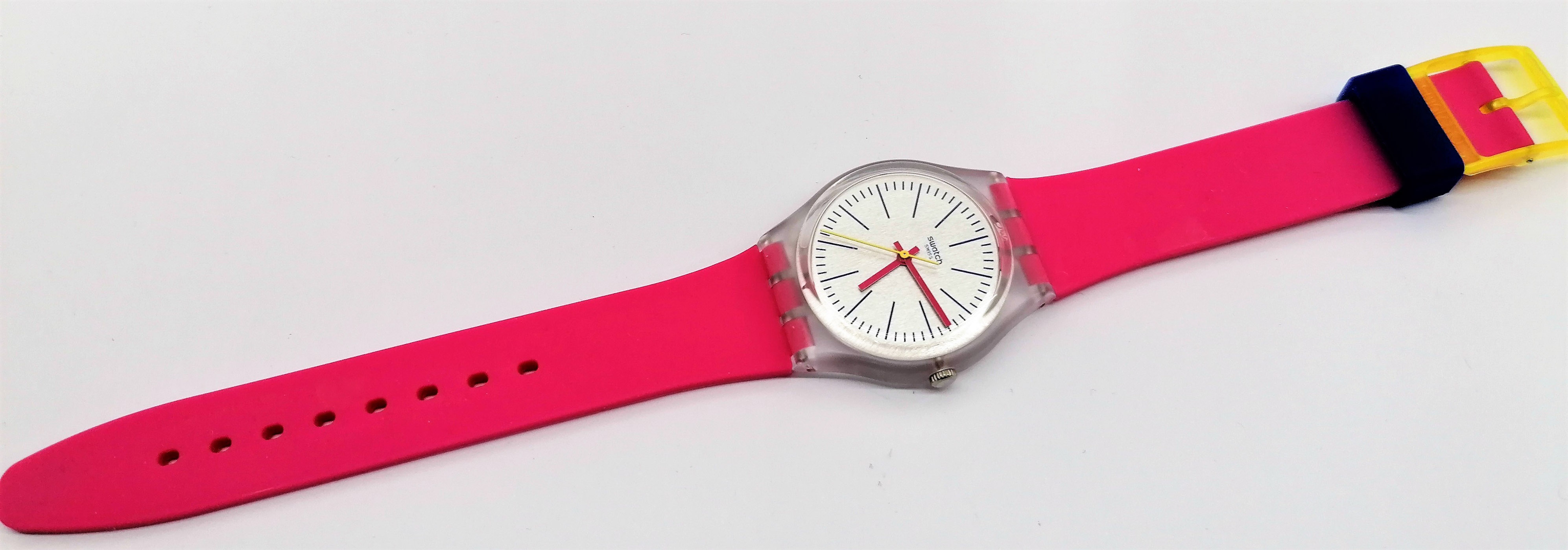 Swatch Standards 2018 - GE256 - Fluo Pink - NUOVO - perfettamente funzionante nella custodia Speciale - Display analogico - Resistente all'acqua fino a 3 bar - Tipo di movimento Quarzo Svizzero