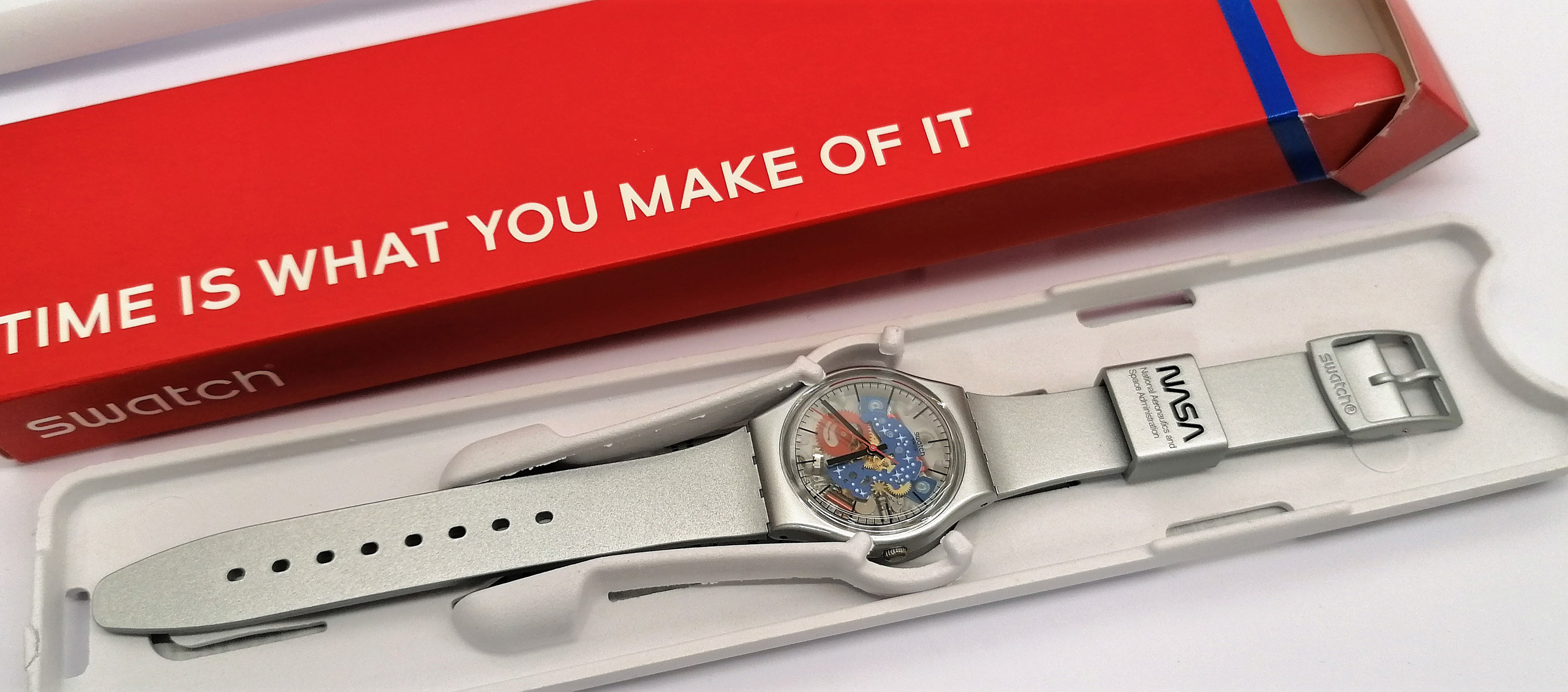 Swatch Special NASA 2021- GZ355 - Take me to the moon - NUOVO - perfettamente funzionante nella custodia Speciale - cassa in Plastica - Display analogico - Resistente all'acqua fino a 3 bar - Tipo di movimento Quarzo Svizzero - Cinturino in silicone -