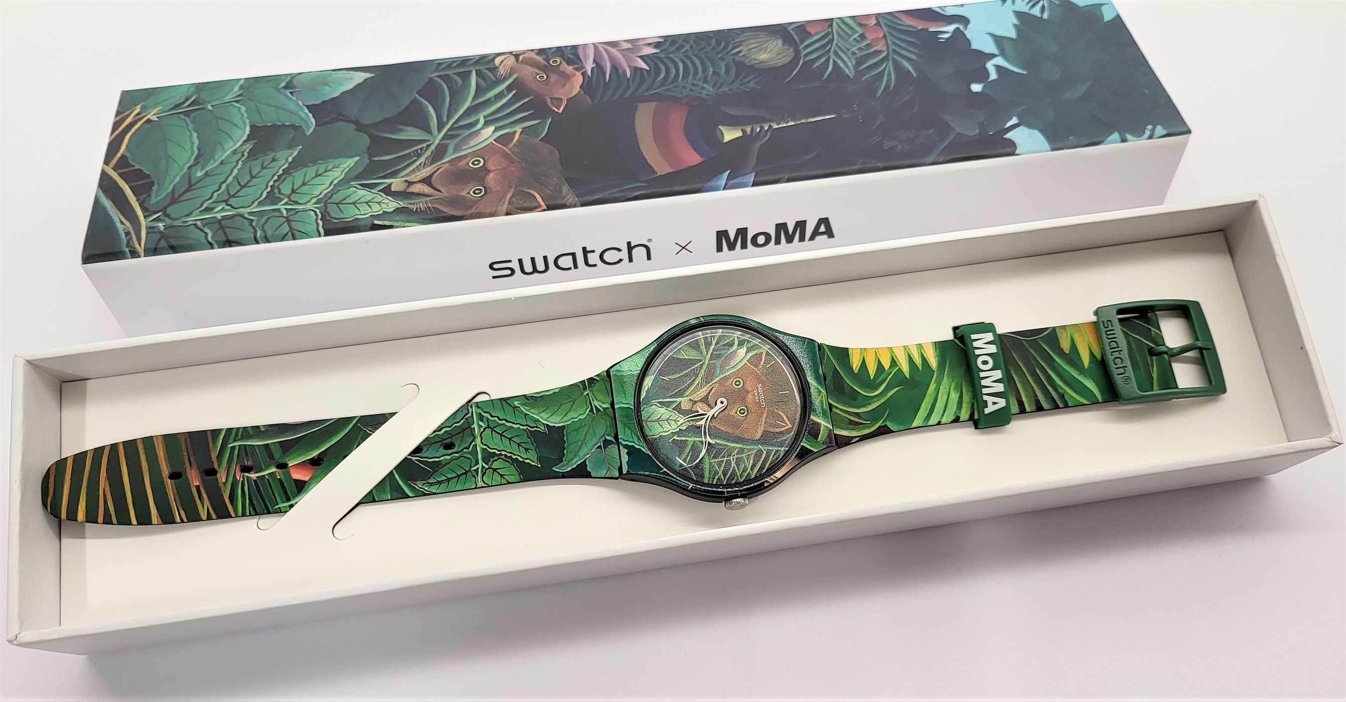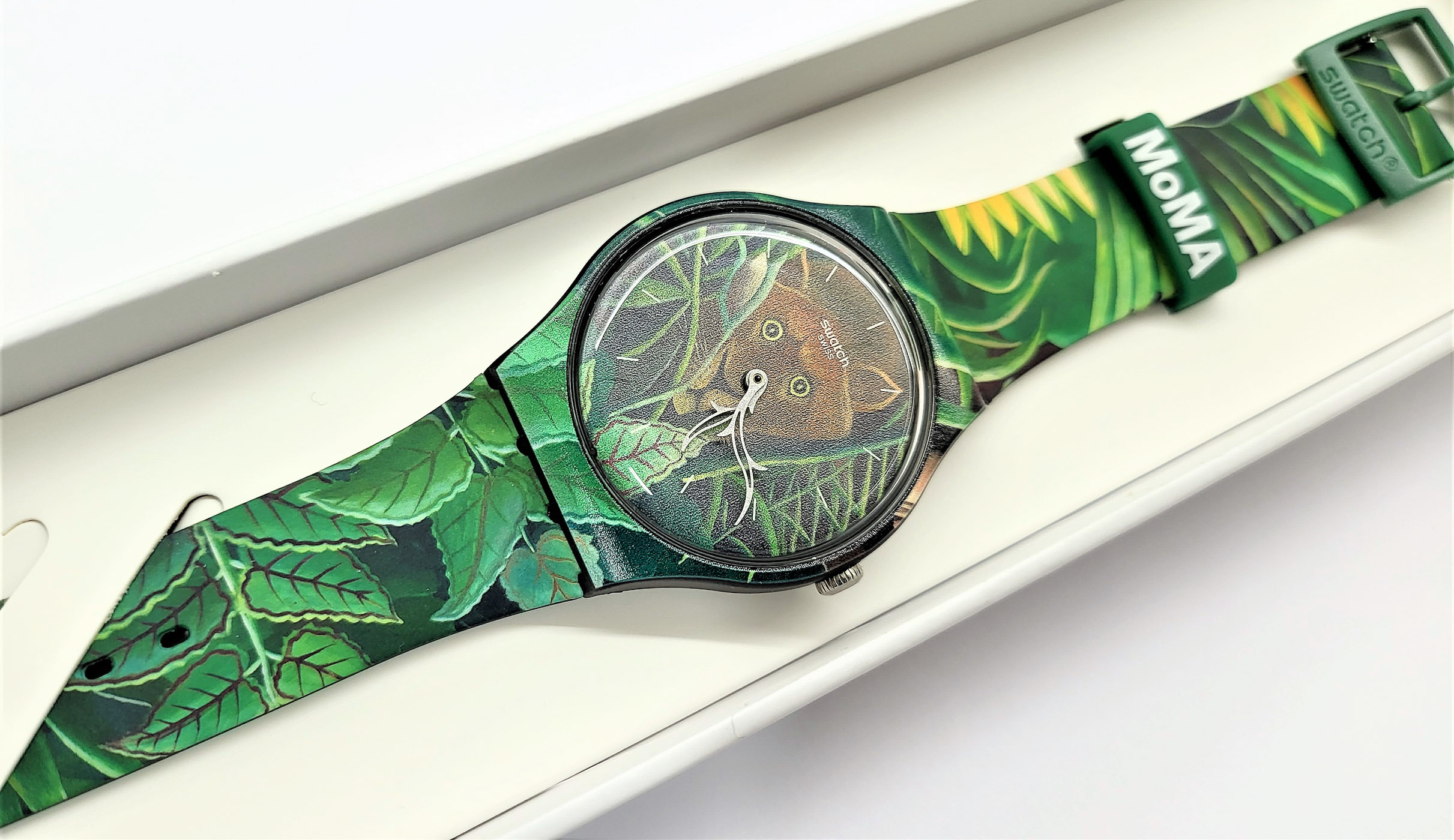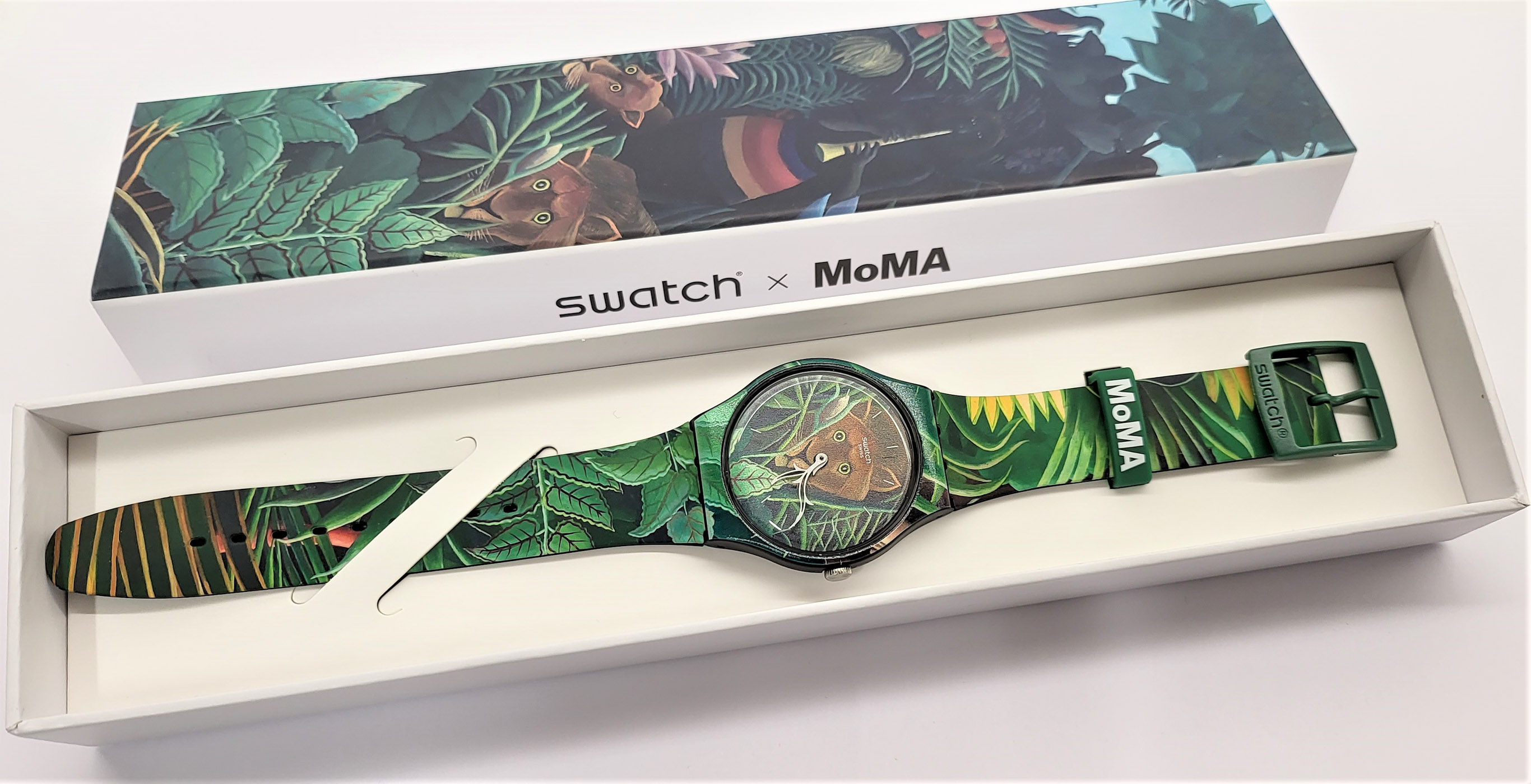 Swatch Special 2021 - SUOZ333 - The Dream By Henry Rousseau - NUOVO - Occasione New Yorker Museum of Modern Art (MoMa) - perfettamente funzionante nella sua confezione speciale - Display analogico - Resistente all'acqua fino a 3 bar - Tipo di movimento Quarzo Svizzero - Cassa in Plastica e cinturino in silicone - dm cassa 41 mm -