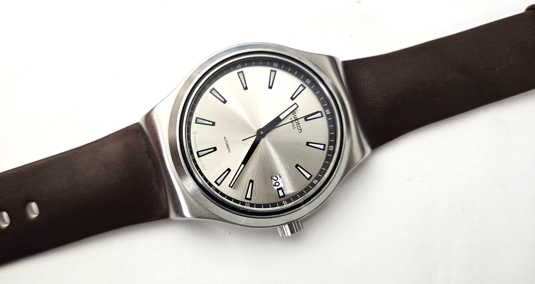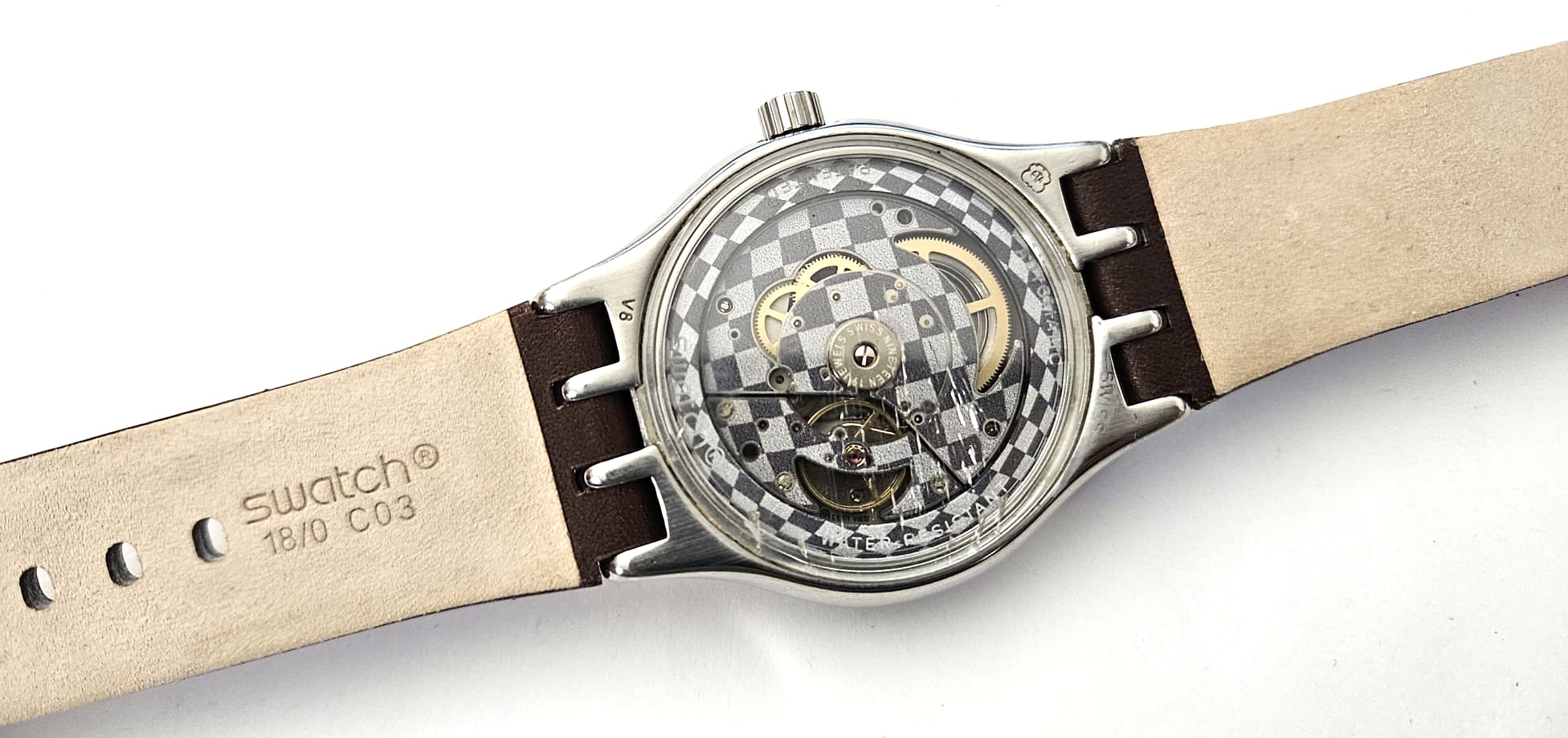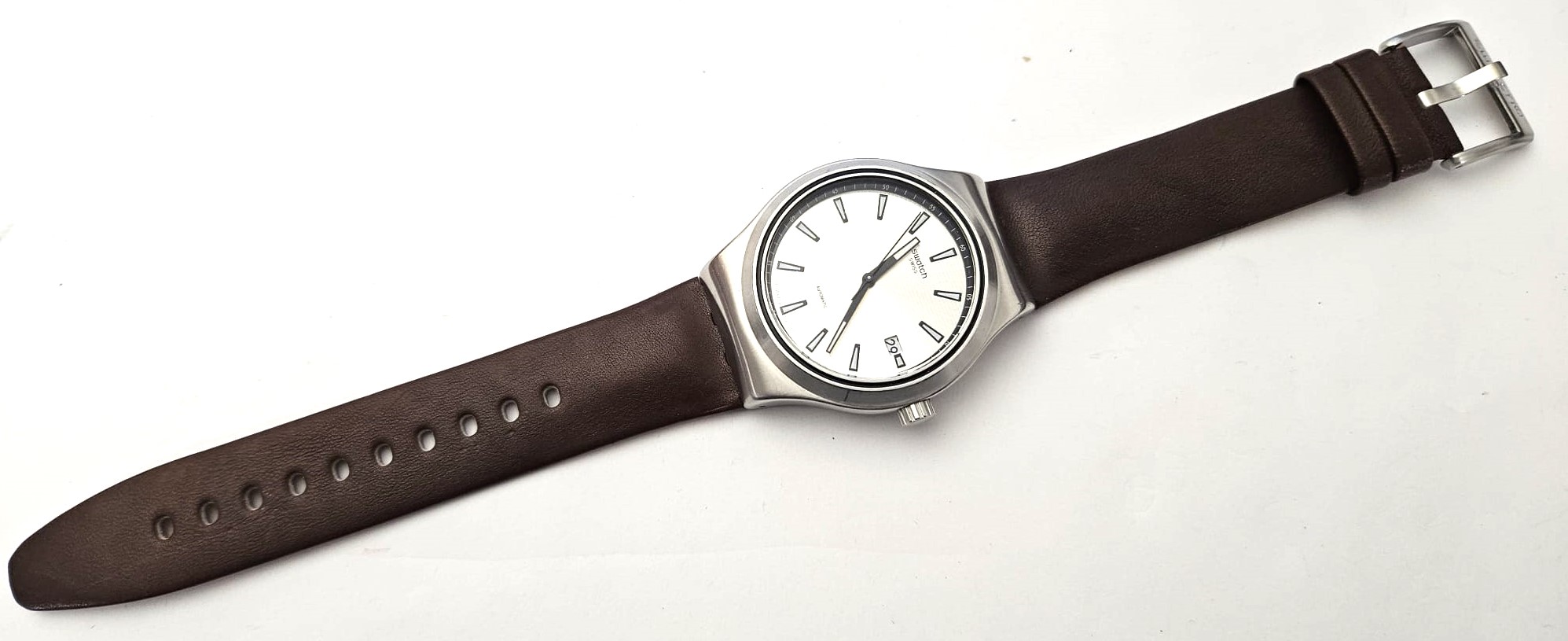 Swatch Irony Sistem51 2018 - YIS424 - Sistem Silverline - Leggermente usato - perfettamente funzionante senza la sua custodia originale - Display analogico - Resistente all'acqua fino a 3 Bar - Tipo di movimento Automatico - cinturino in pelle nuovo - dm. cassa 42 mm