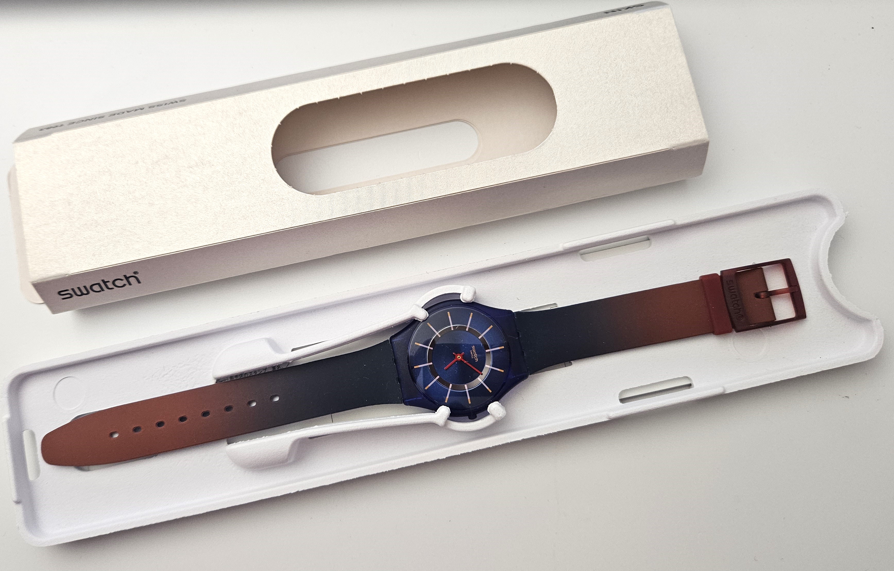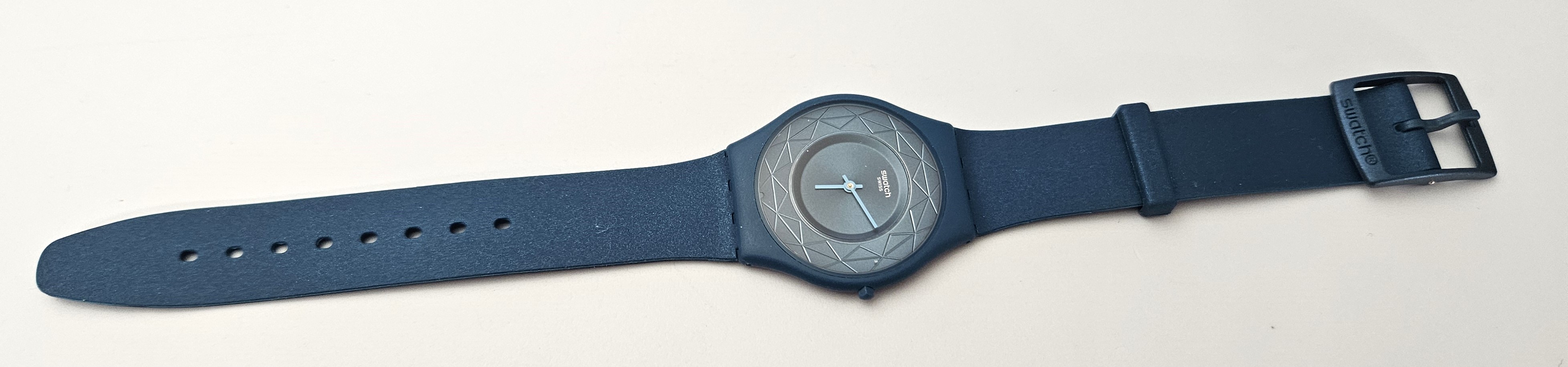 Swatch Irony Skin 2021 - SYXS134 - Blue moire (cassa 38 mm) - Nuovo - perfettamente funzionante - Display Analogico - Resistente all'acqua fino a 3 bar - Tipo di movimento Quarzo Svizzero - completo di scatola originale e garanzia - cassa in acciaio e cinturino in silicone -
