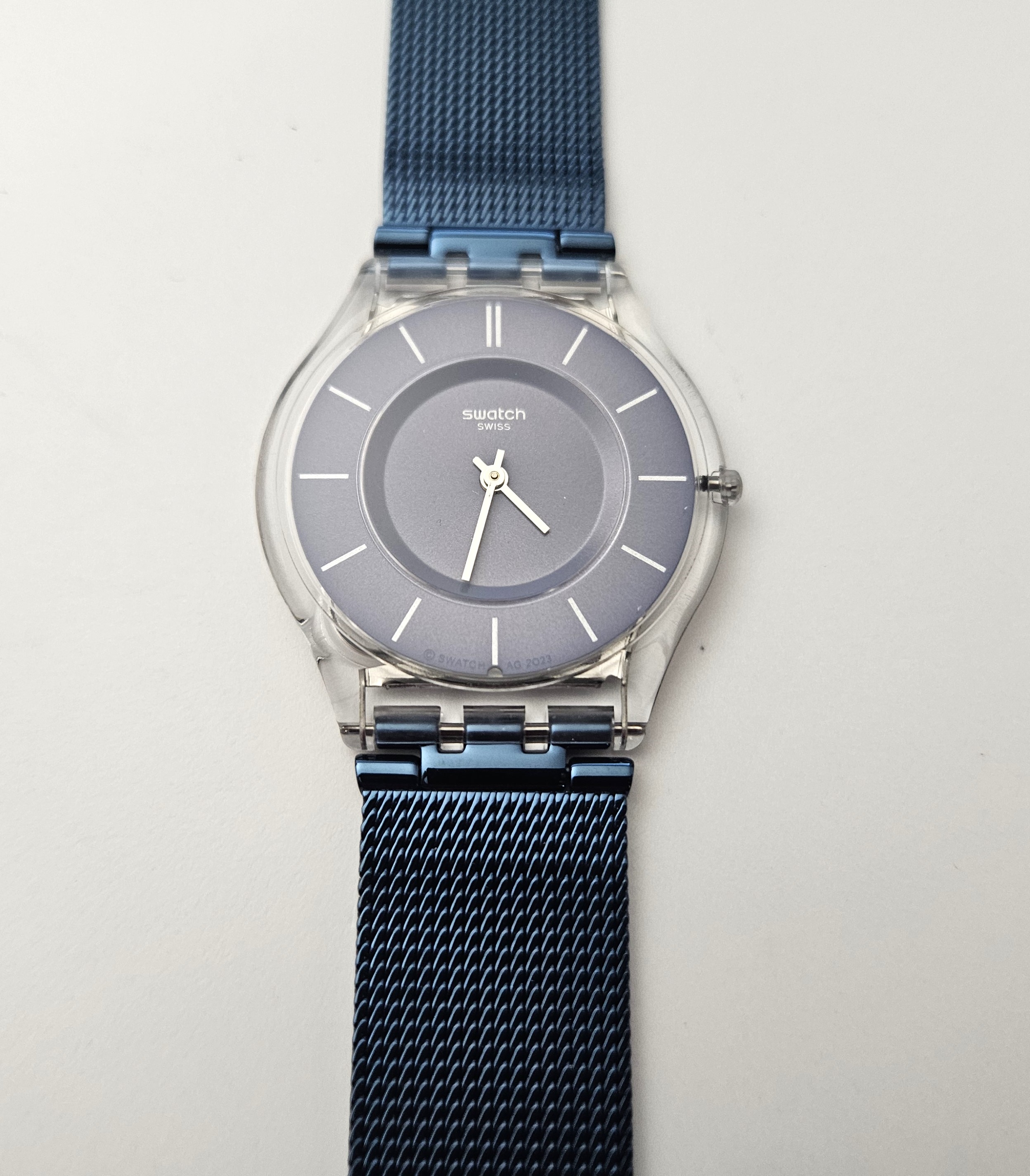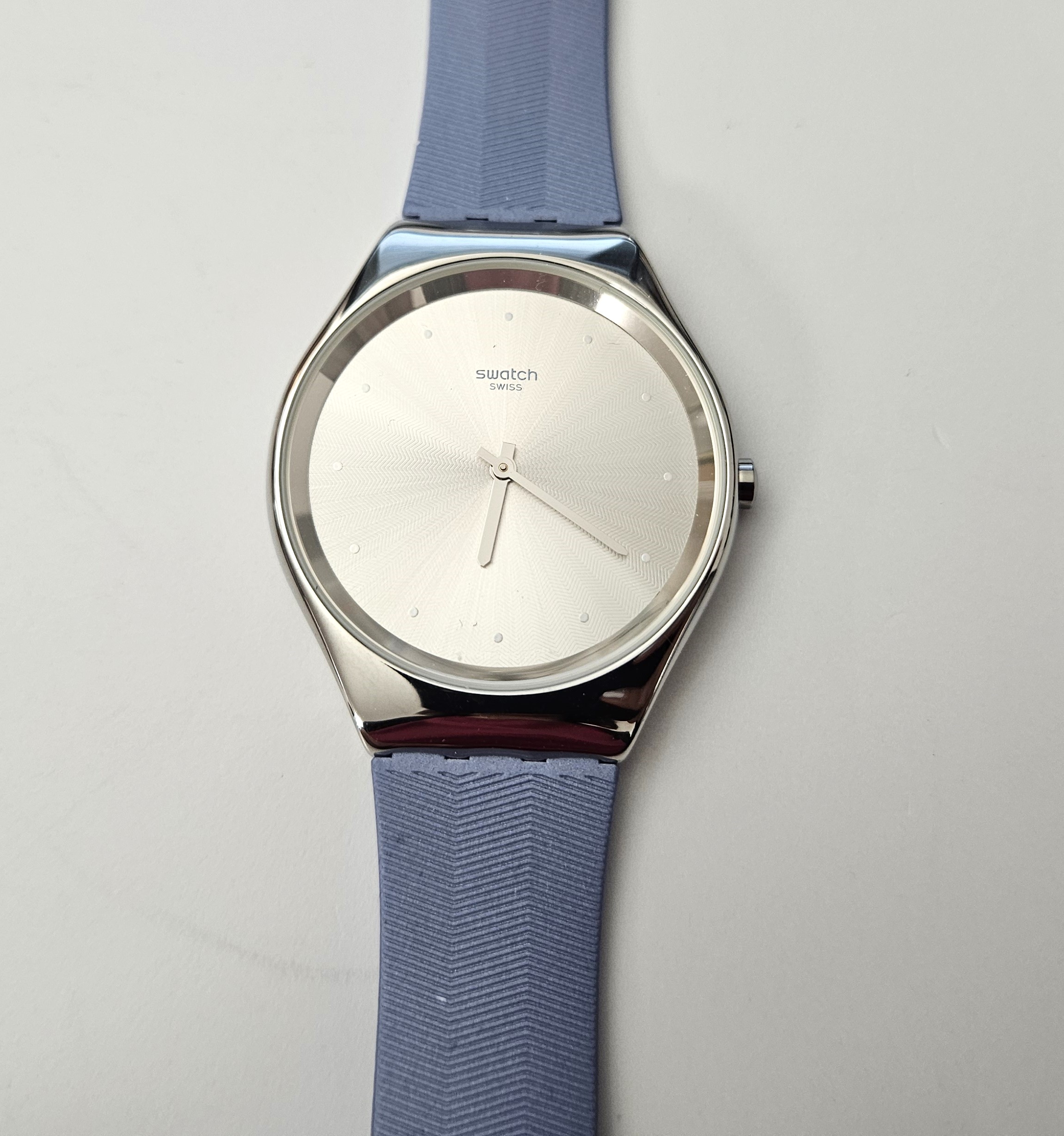 Swatch Skin 2024 - SS08K120S - Cool Skies - Nuovo - perfettamente funzionante - completo di scatola originale e batteria - diametro cassa 34 mm - Display Analogico - Resistente all'acqua fino a 3 bar - Tipo di movimento Quarzo Svizzero - cassa bio-sources e cinturino in metallo a maglia milanese -