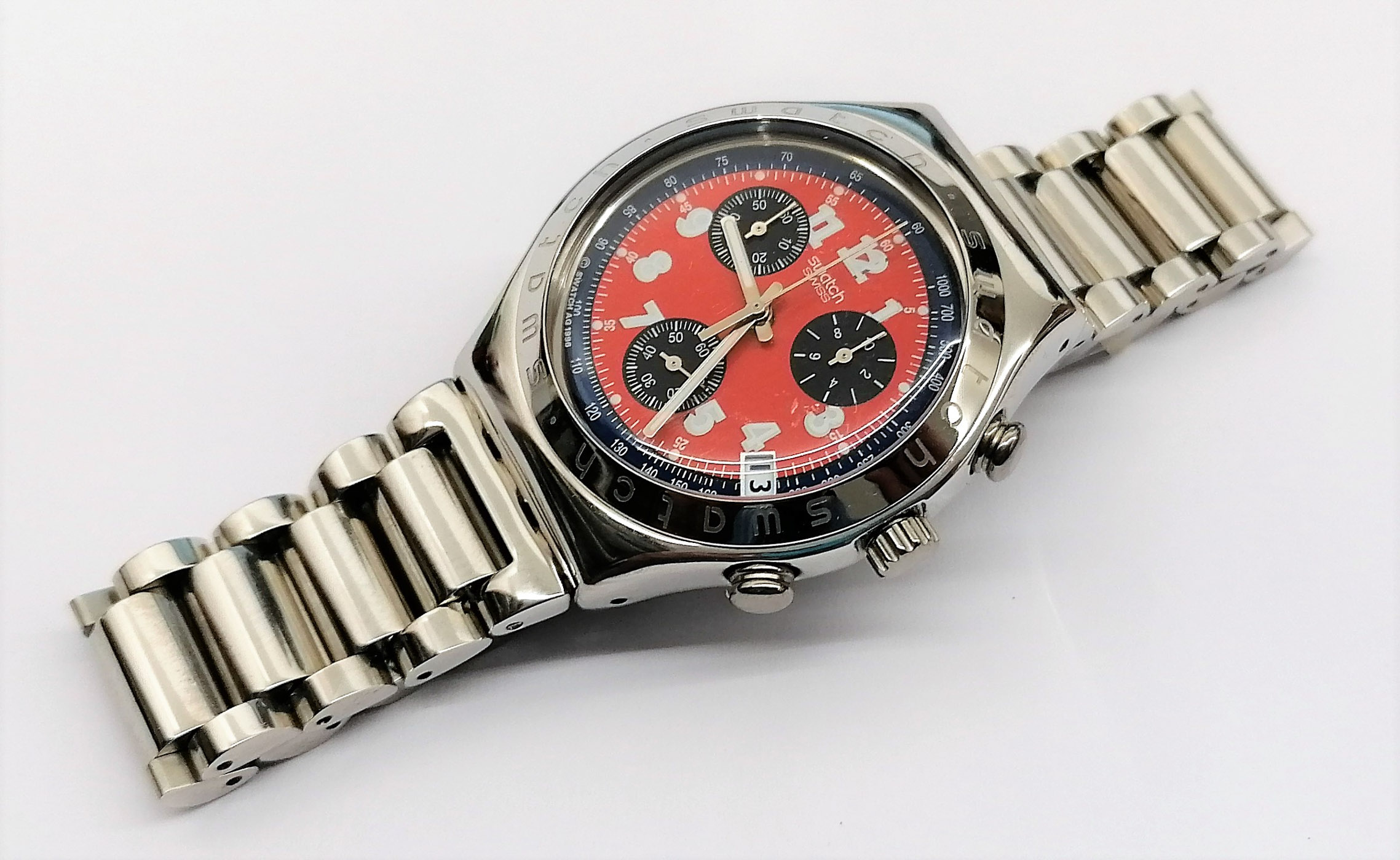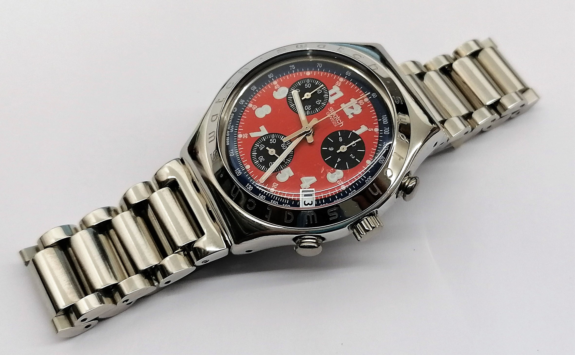 Swatch Chrono Irony 1997 - YCS405 - Secret Agent Red - NUOVO - perfettamente funzionante nella sua custodia originale - Display analogico - Resistente all'acqua fino a 3 bar - Tipo di movimento Chronografo