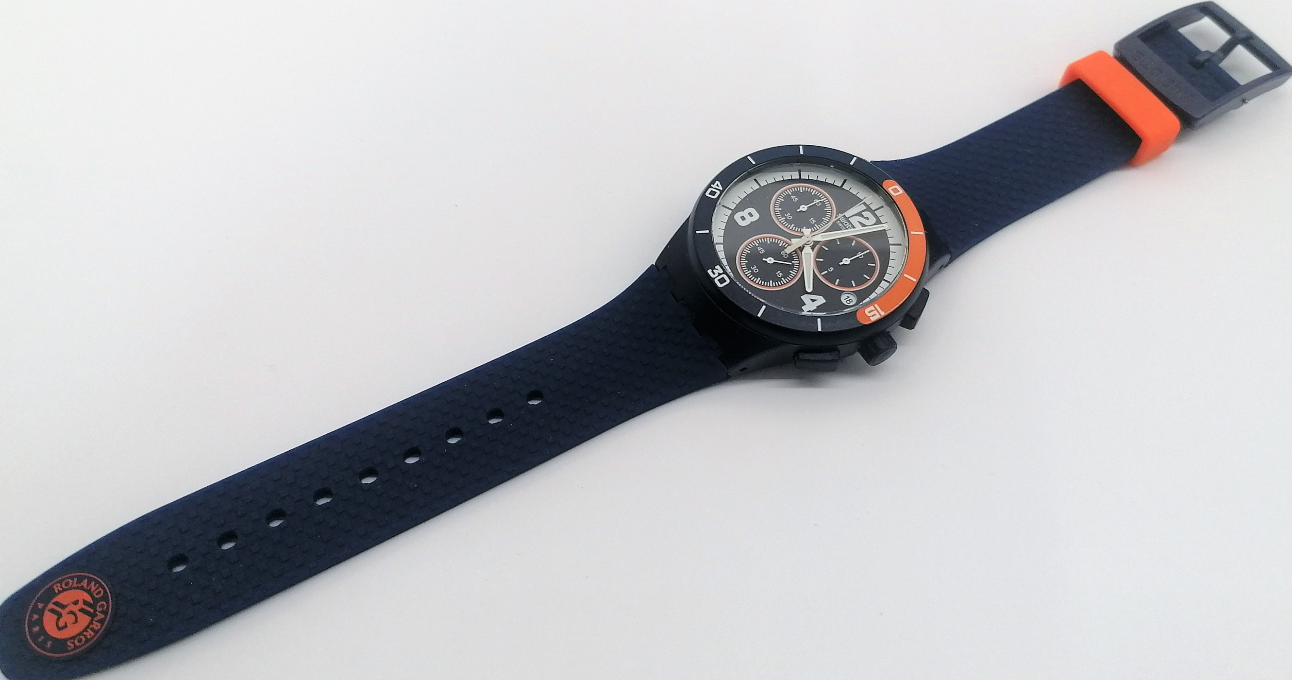Swatch Special Chrono 2018 - SUSZ402 - Match Point - Roland Garros 2018 - Nuovo - perfettamente funzionante nella sua custodia originale - Display analogico - Resistente all'acqua fino a 3 Bar - Tipo di movimento Quarzo Svizzero - Cassa in plastica e Cinturino in Silicone -